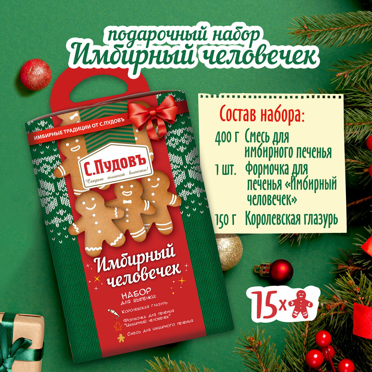 Новогодний подарочный набор для выпечки печенья "Имбирный человечек", сладкий подарок для детей ( мучная смесь для выпечки, глазурь, формочка), С.Пудовъ интересное: