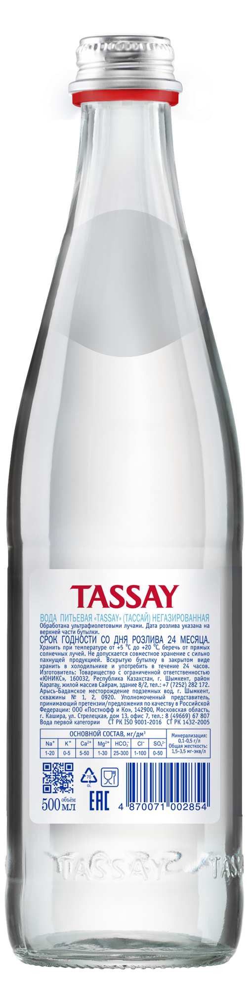 Вода питьевая TASSAY (Тассай), негазированная, 0.5 л х 12 шт, стекло