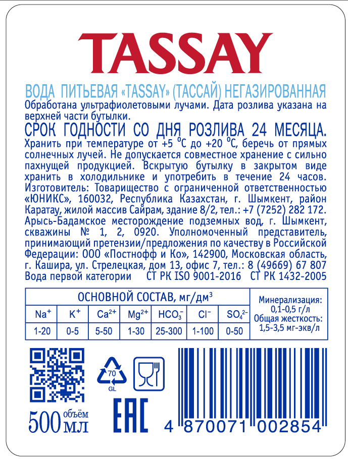 TASSAY природная питьевая вода, негазированная, стекло 0.5 л (12 штук)