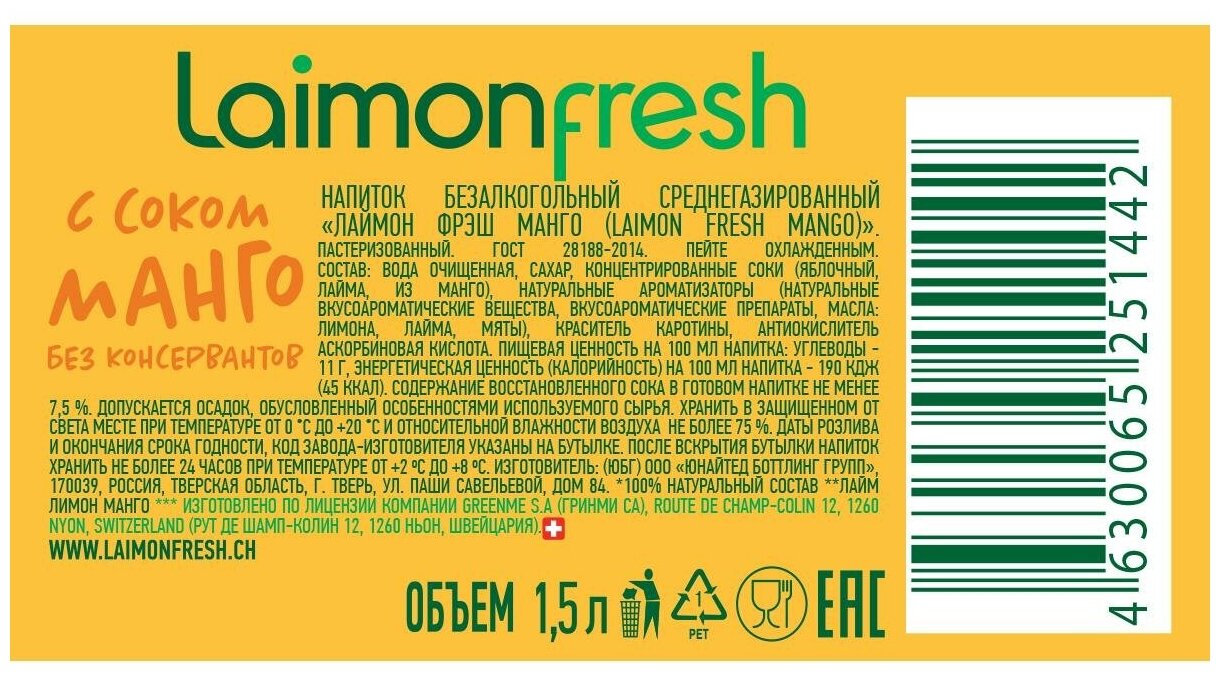 Ниже Вы можете прочитать отзывы на Газированный напиток Laimon Fresh "Манго" 1.5 л*6, ознакомится с подробными характеристиками, посмотреть интересные обзоры и фотографии на Газированный напиток Laimon Fresh "Манго" 1.5 л*6.