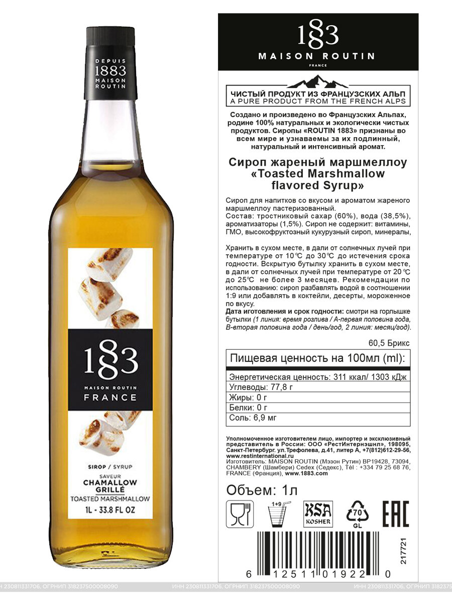 Сироп 1883 Maison Routin Toasted Marshmallow (Жареный маршмеллоу), 1л