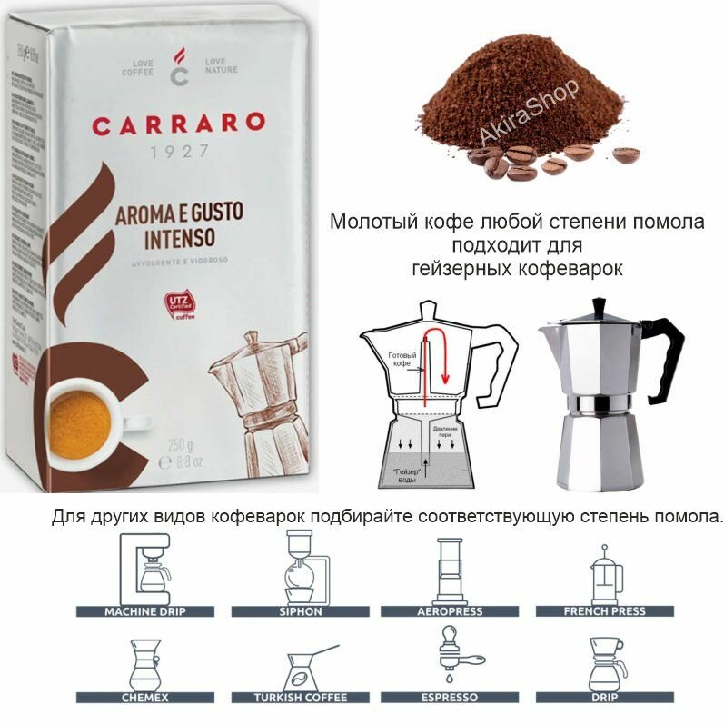 Кофе молотый Carraro Aroma&Gusto intenso вакуум, 250 гр