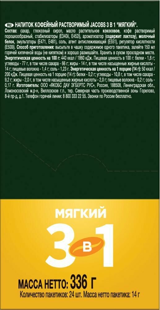 Напиток кофейный растворимый JACOBS 3 в 1 “Мягкий” 14 г*24 шт, 336 г