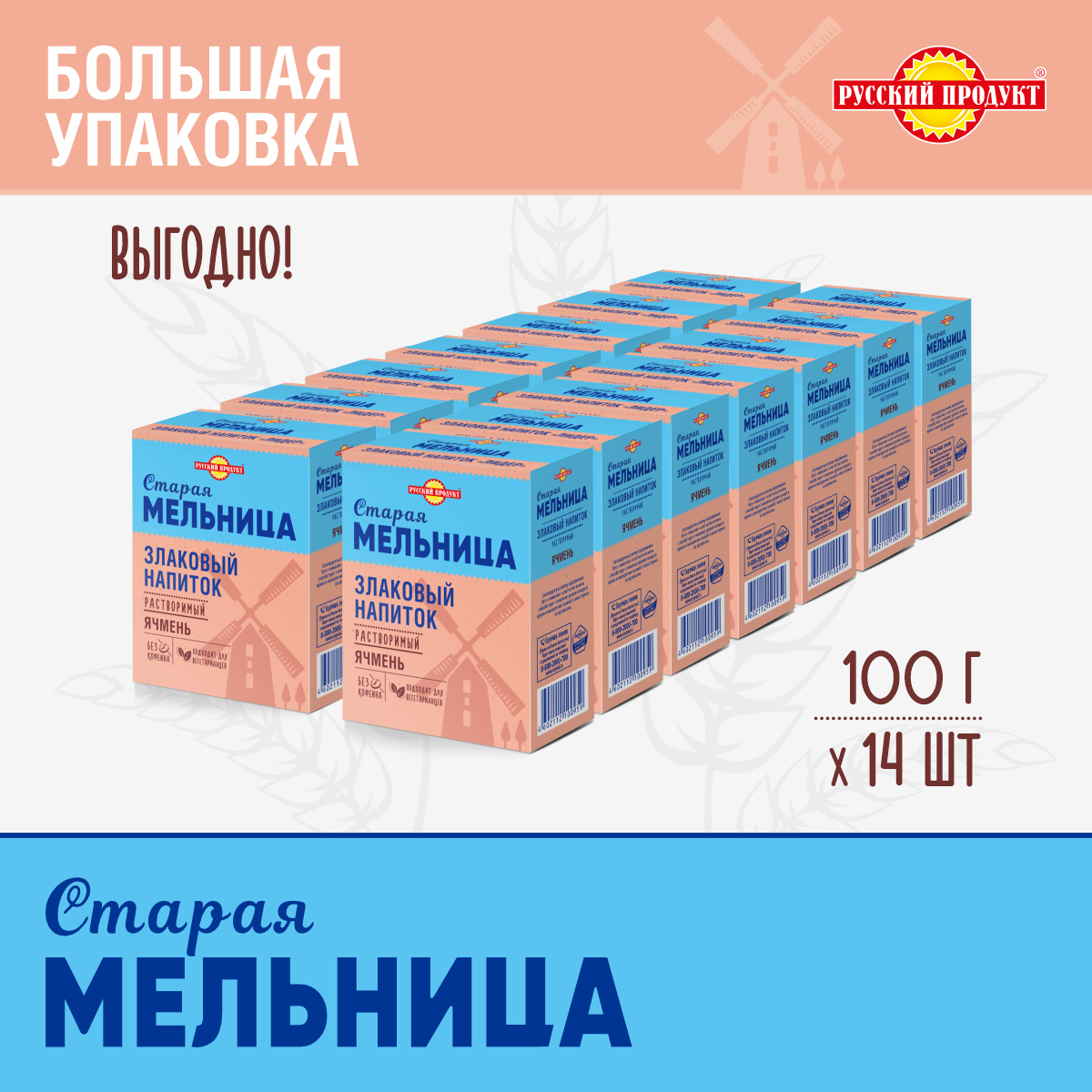 Напиток злаковый Старая Мельница Лидер без кофеина ячменный 100 г x 14 шт в упаковке, Русский Продукт