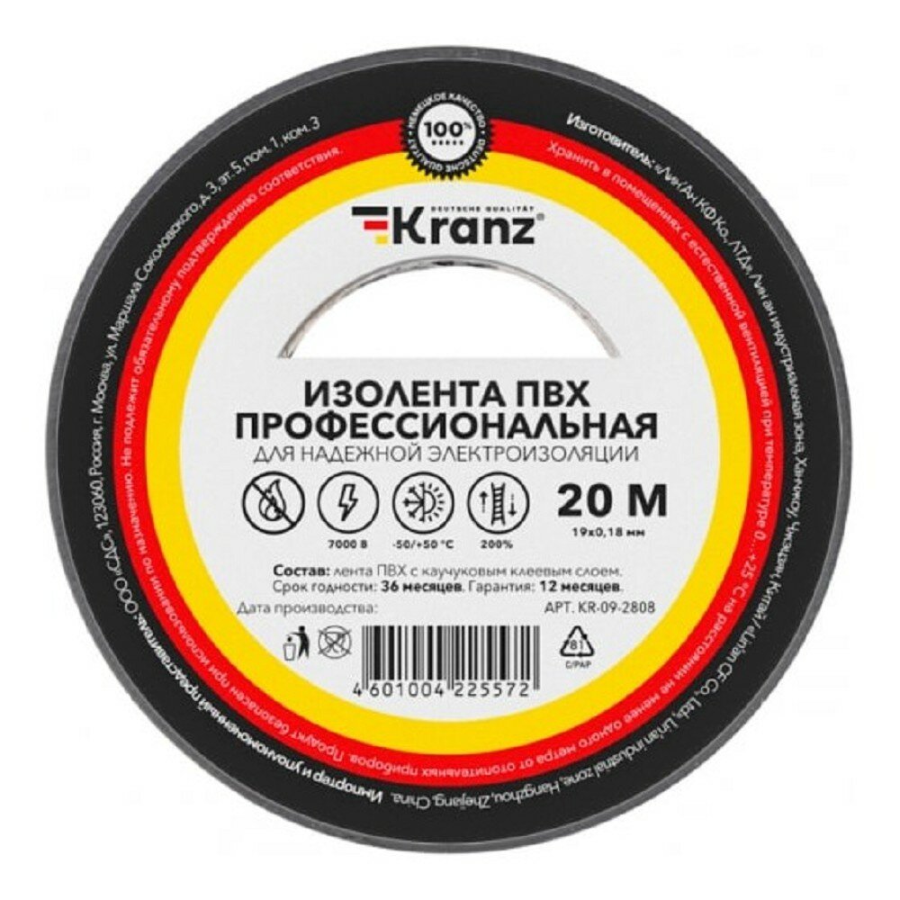 Rexant KR-09-2801 Изолента ПВХ профессиональная, 0,18х19 мм, 20 м, белая (10 шт/уп) KRANZ
