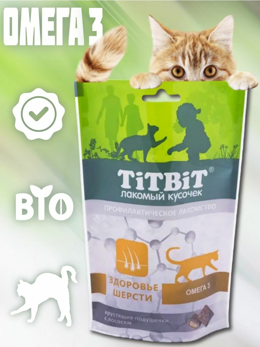 Хрустящие подушечки TitBit для кошек, для здоровья шерсти, с лососем, 60 г 6709896