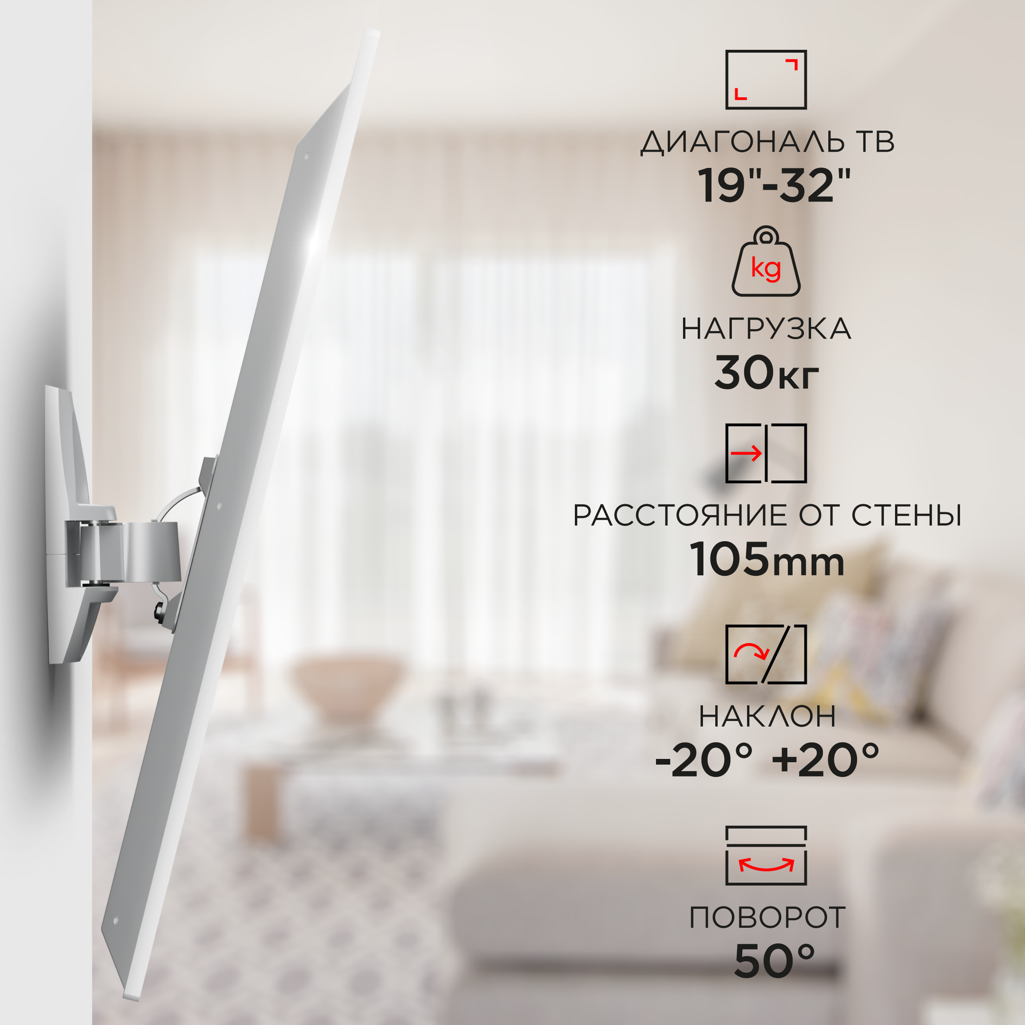 Кронштейн Holder LCDS-5062 белый для ЖК ТВ 19-32 настенный от стены 105мм наклон +15°/-25° поворот 50° до 30кг