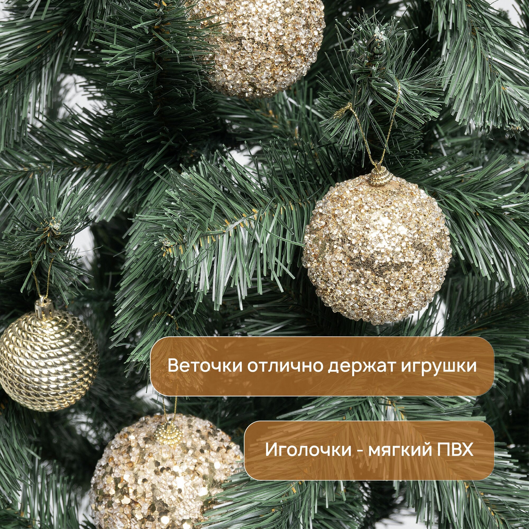 «Хвоя» пушистая, глубокого зелёного цвета. Ветки достаточно крепкие, не прогибаются под весом стеклянных и фарфоровых игрушек. |
