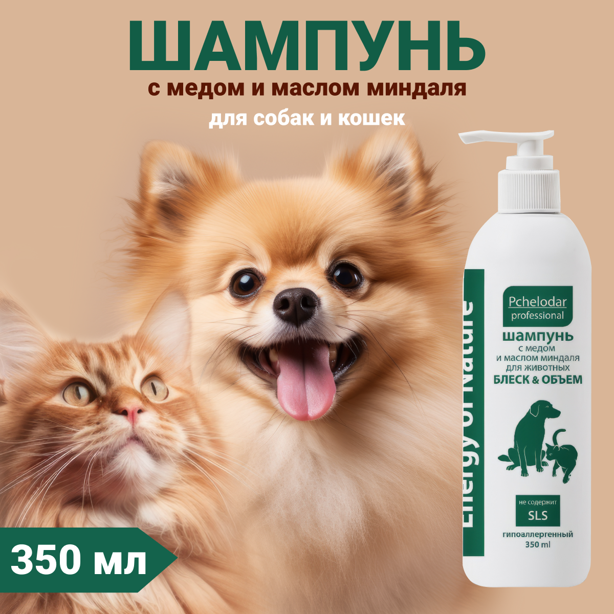 Шампунь для собак и кошек гладкошерстных пород пчелодар с медом и маслом миндаля для блеска и объёма 350мл