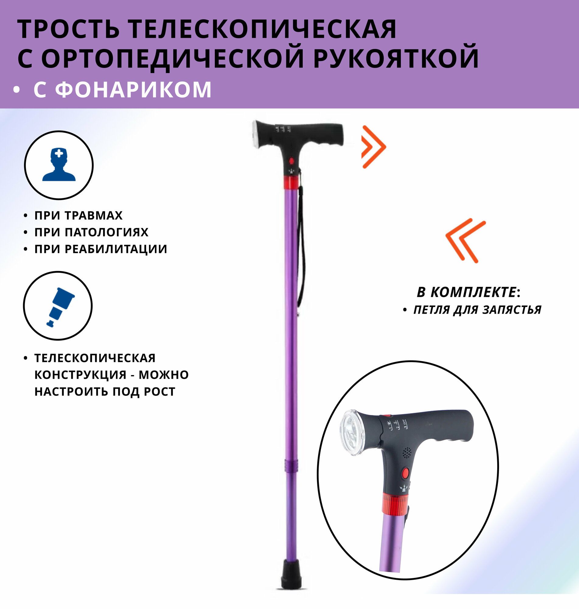 Трость с фонариком Амрос AMCMF55 BK высота 76-99 см (3 положения) нагрузка до 113 кг, черная (цвет: фиолетовый)