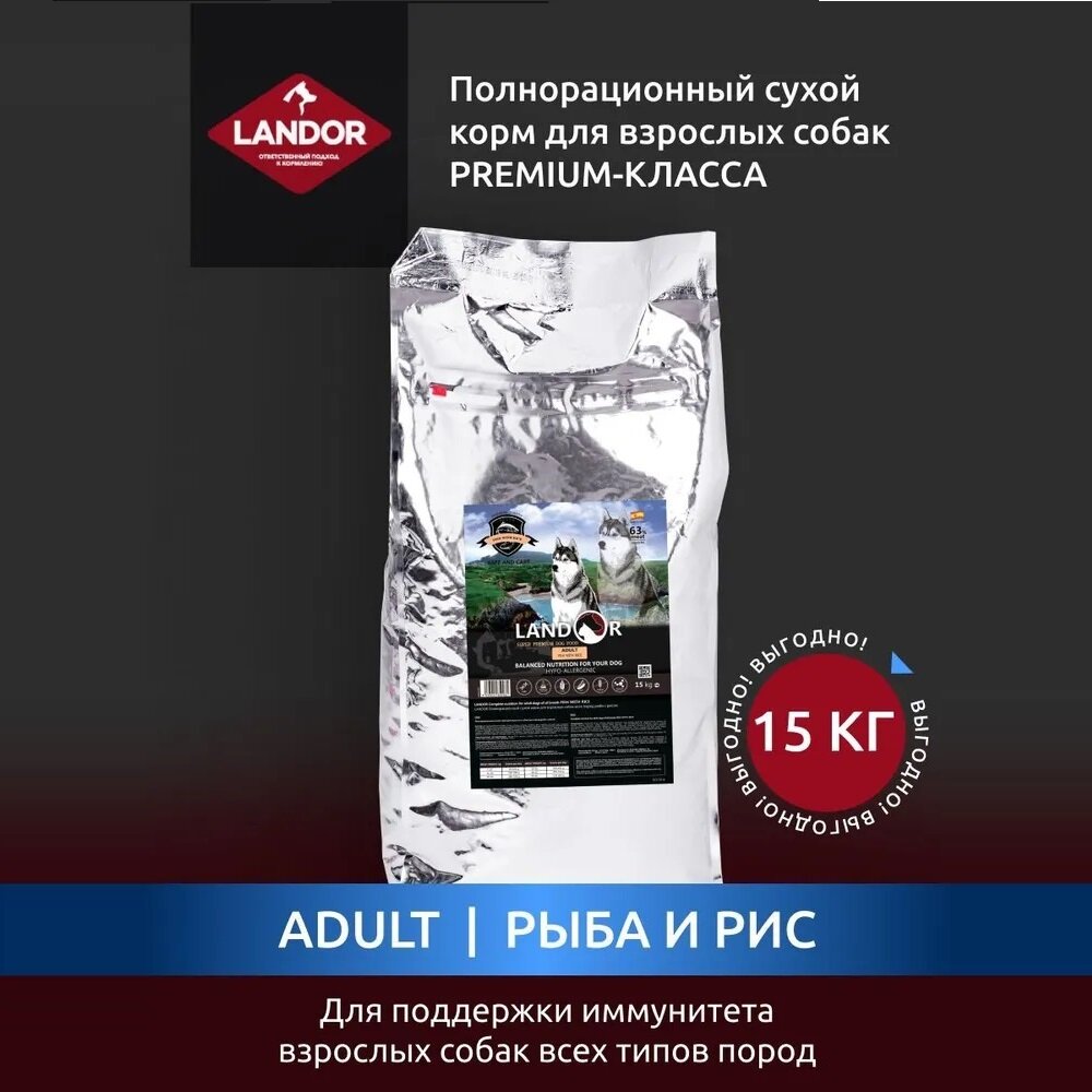 LANDOR DOG ADULT FISH для взрослых собак всех пород с рыбой (15 кг)