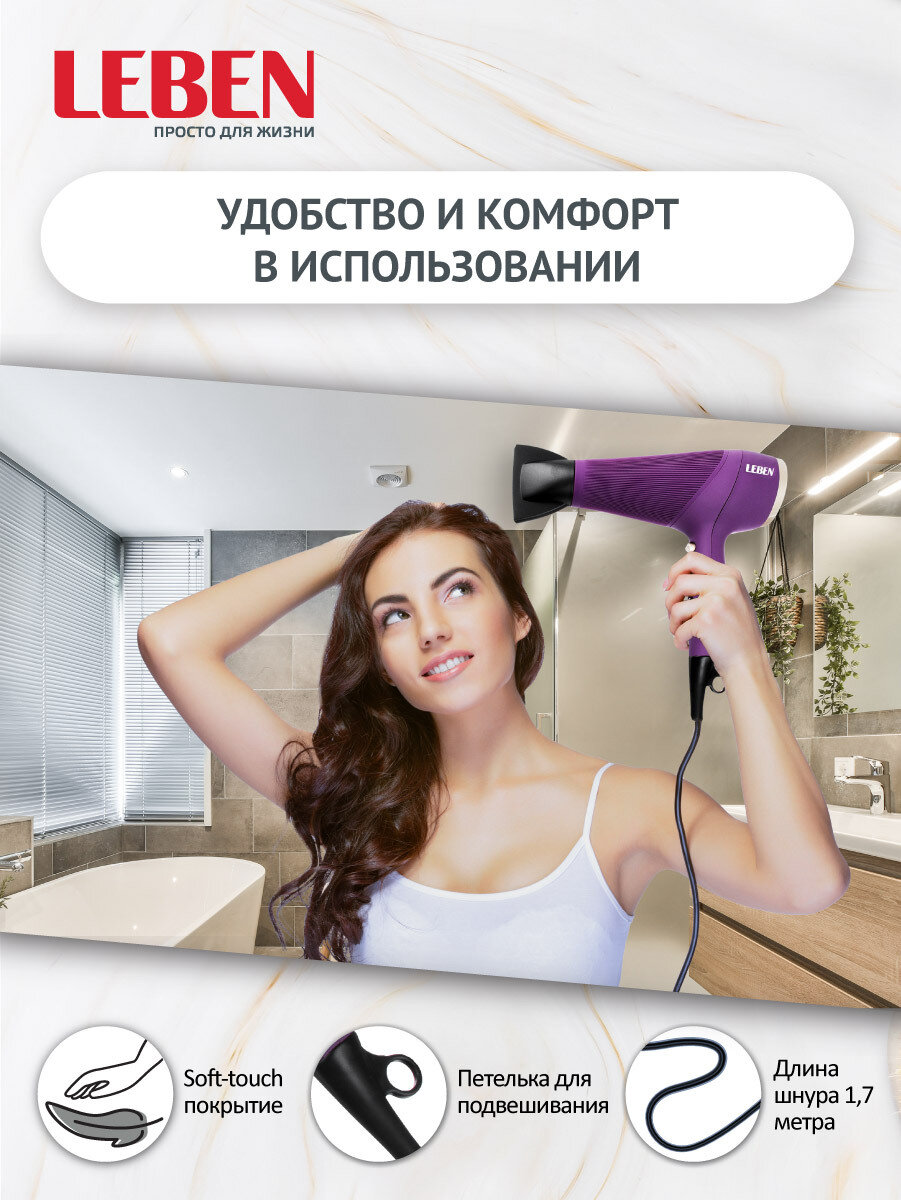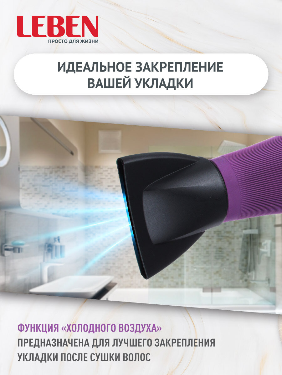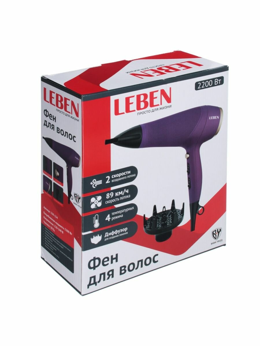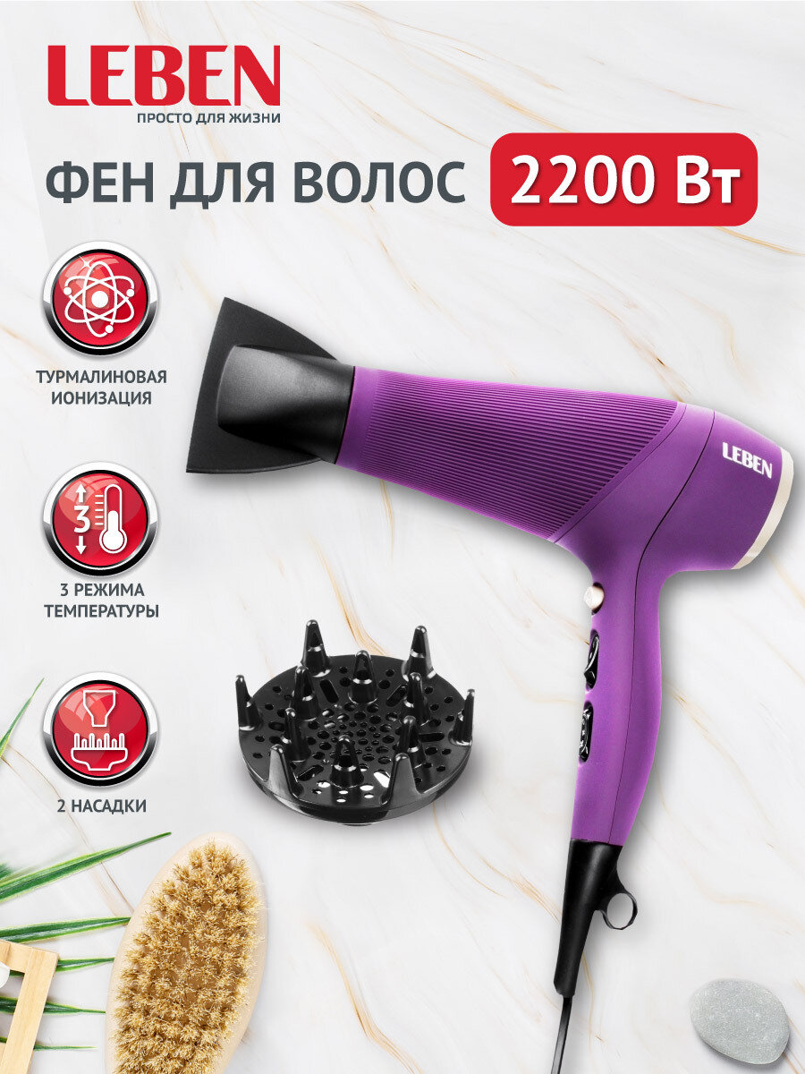 Фен для волос с диффузором и ионизацией, 2 скорости, с 3-мя режимами температуры, 2200 Вт LEBEN интересное: