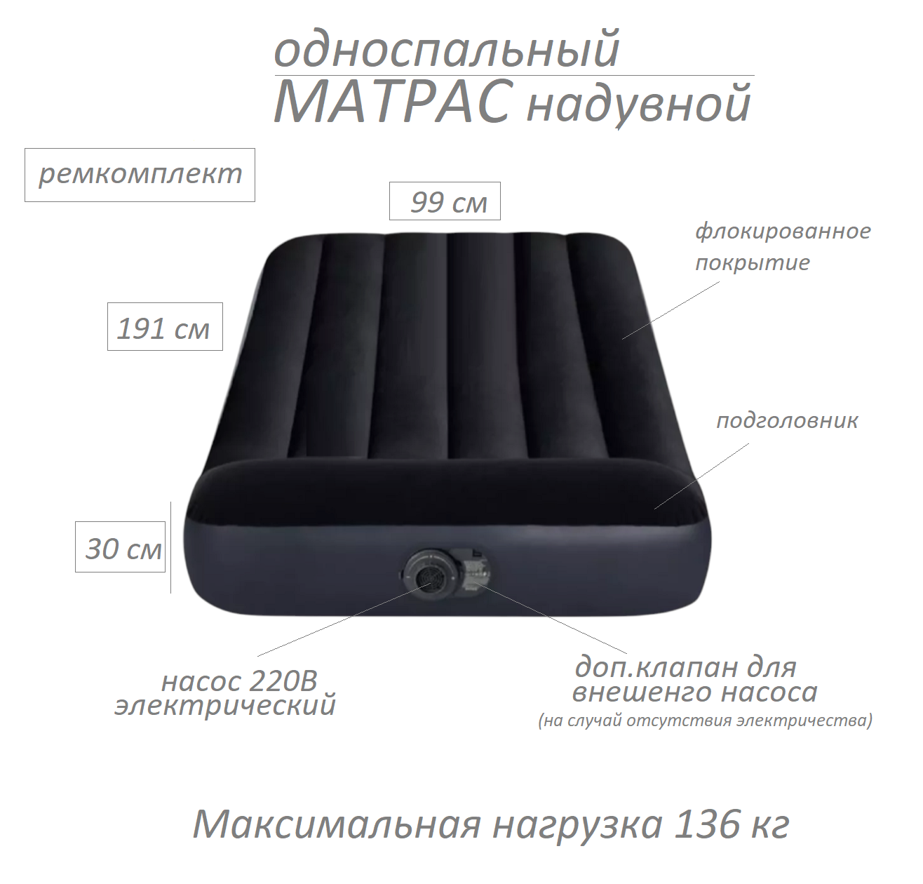 Матрас флокированный Intex TWIN PILLOW REST CLASSIC AIRBED WITH FIBER-TECH BIP, эл/н220V, 191х99х25