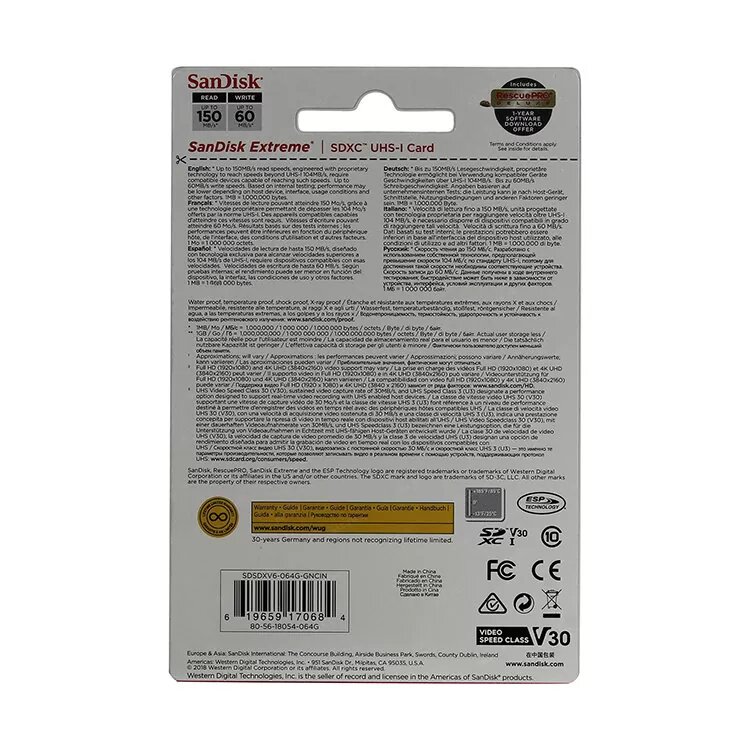 Sandisk Extreme SDXC Class 10 UHS-I V30 U3 150/70 MB/s 64GB SDSDXV6-064G-GNCIN