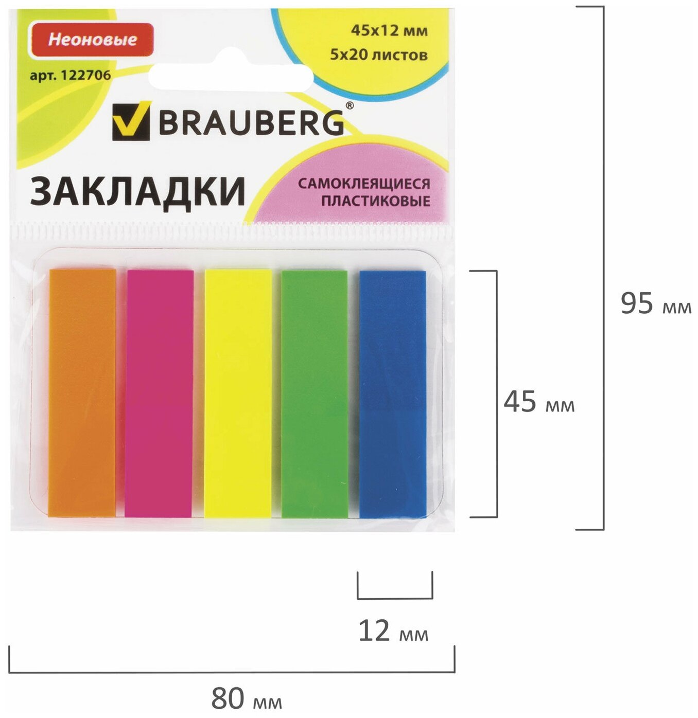 Закладки самоклеящиеся BRAUBERG неоновые, 45х12 мм, 5 цв. х 20 л., в пластиковой книжке, европодвес, 122706, 1 шт