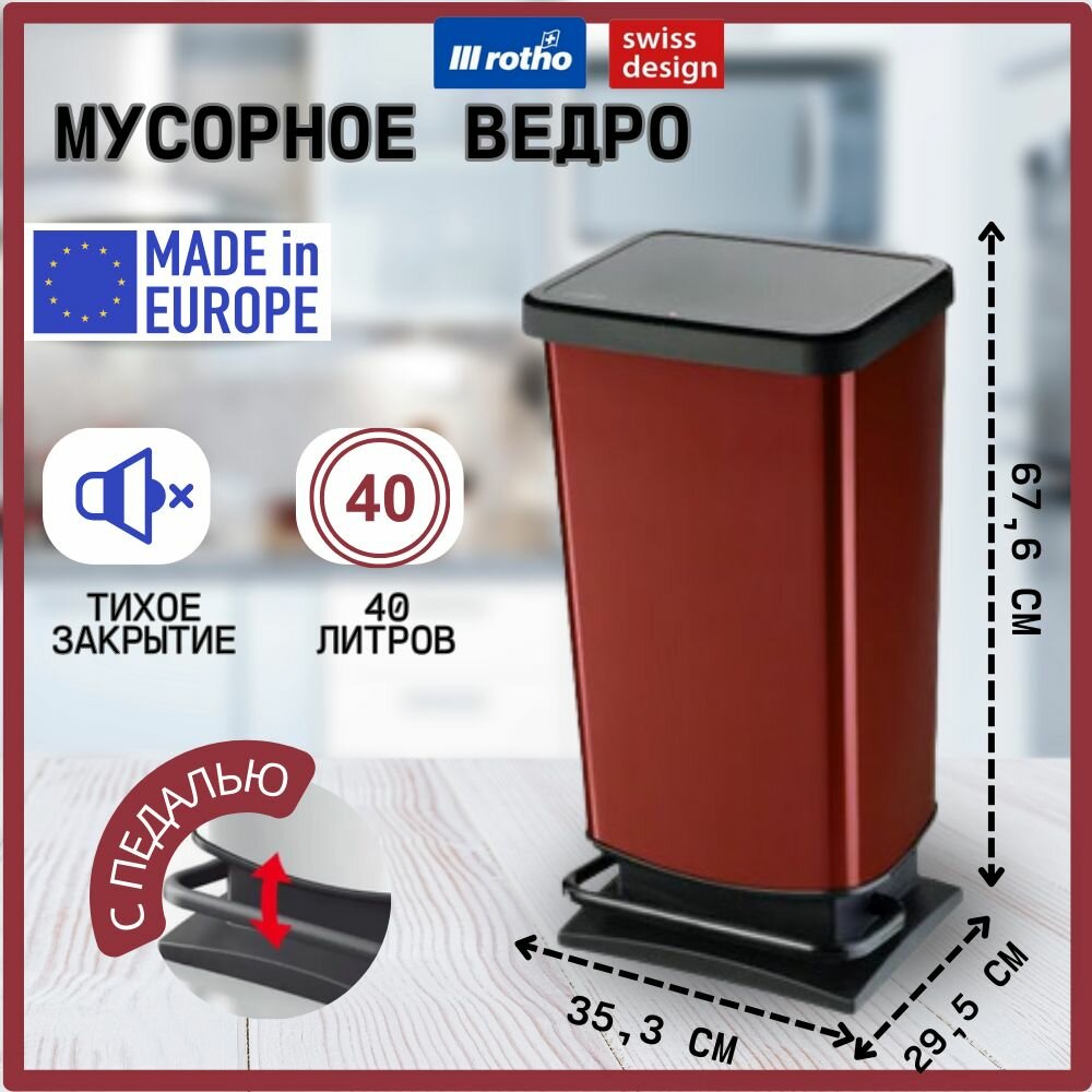 Мусорное ведро с педалью для кухни, для дома и офиса Rotho Paso 40 литров