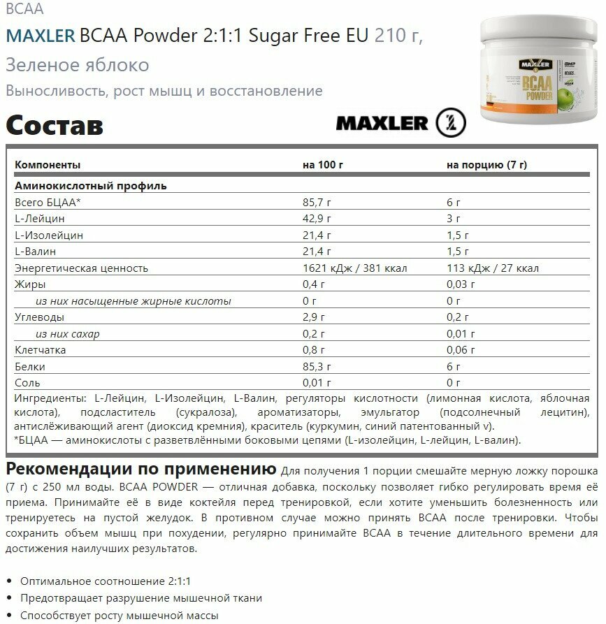 Maxler Eu Bcaa Powder 2:1:1 Sugar Free (210 г) Зелёное Яблоко