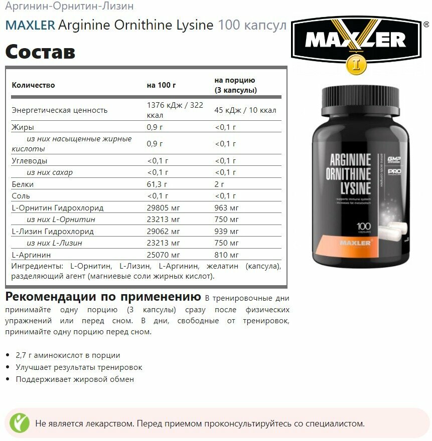 Комплекс аминокислот Maxler Arginine-Ornithine-Lysine ( Аргинин Орнитин Лизин ) - 100 капсул