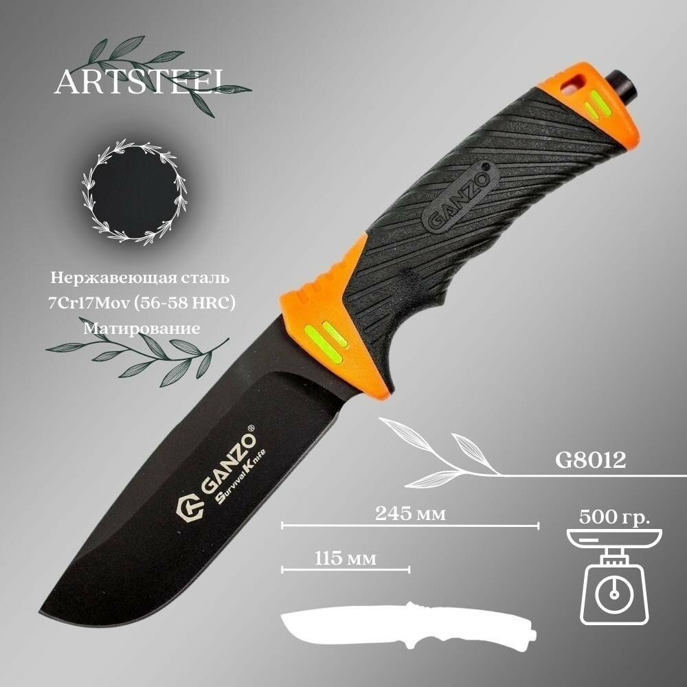 Нож выживальщика Ganzo G8012-OR с огнивом, чёрный/оранжевый