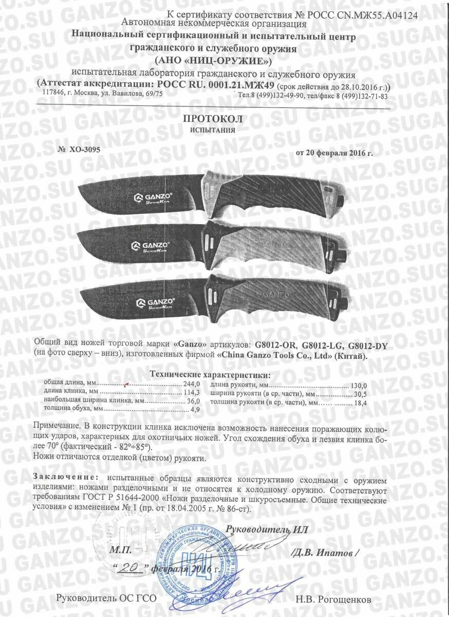 Вместе с ножом также прислали протокол испытания. |