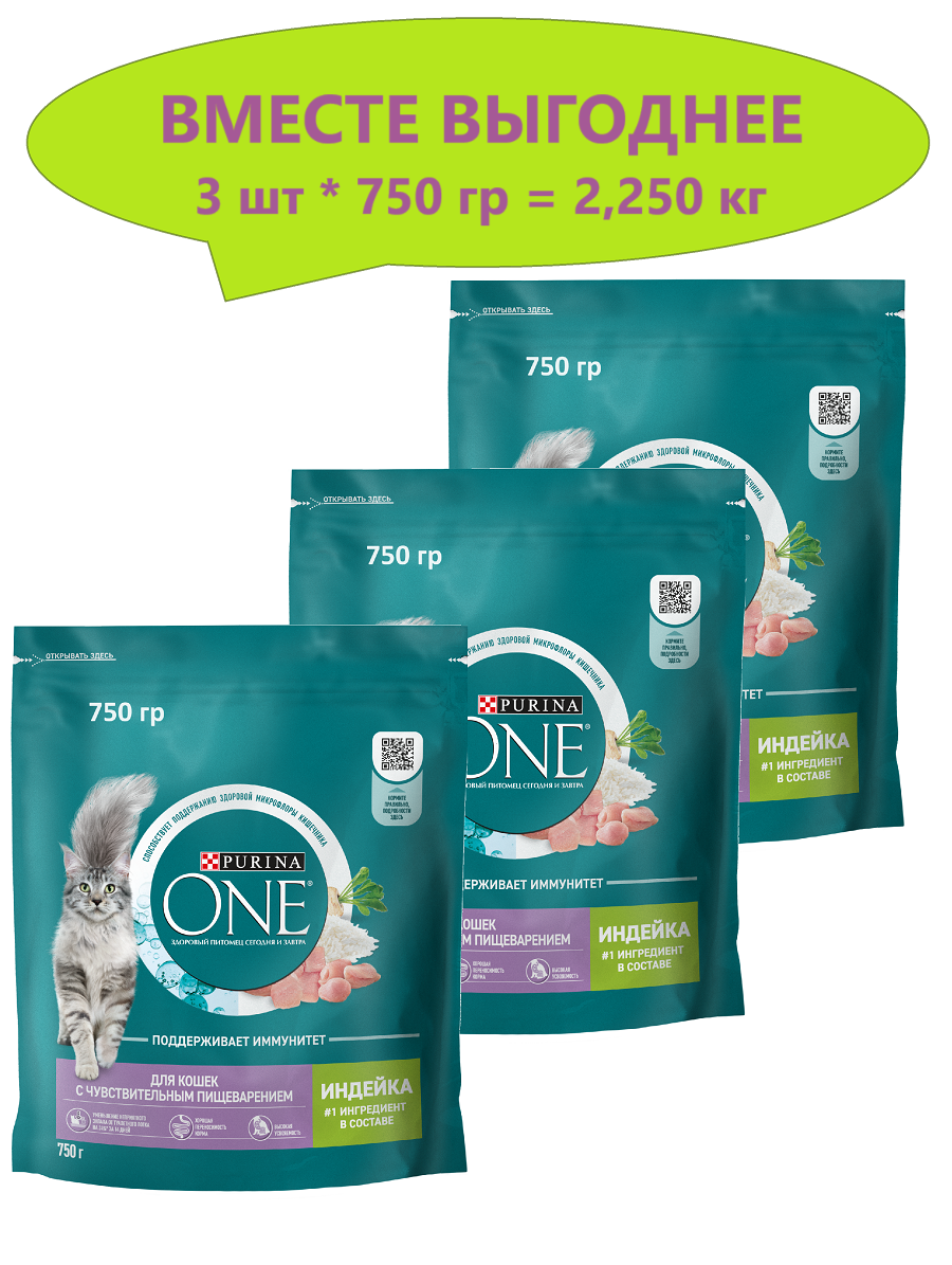 Купить Сухой корм PURINA ONE для взрослых кошек, живущих в домашних условиях, с высоким содержанием индейки и цельными злаками, Пакет, 750 г, 3 упаковки
