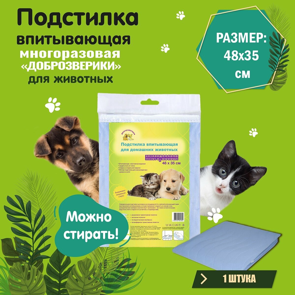 Пеленка многоразовая впитывающая для животных Доброзверики 48х35см. 1 шт.