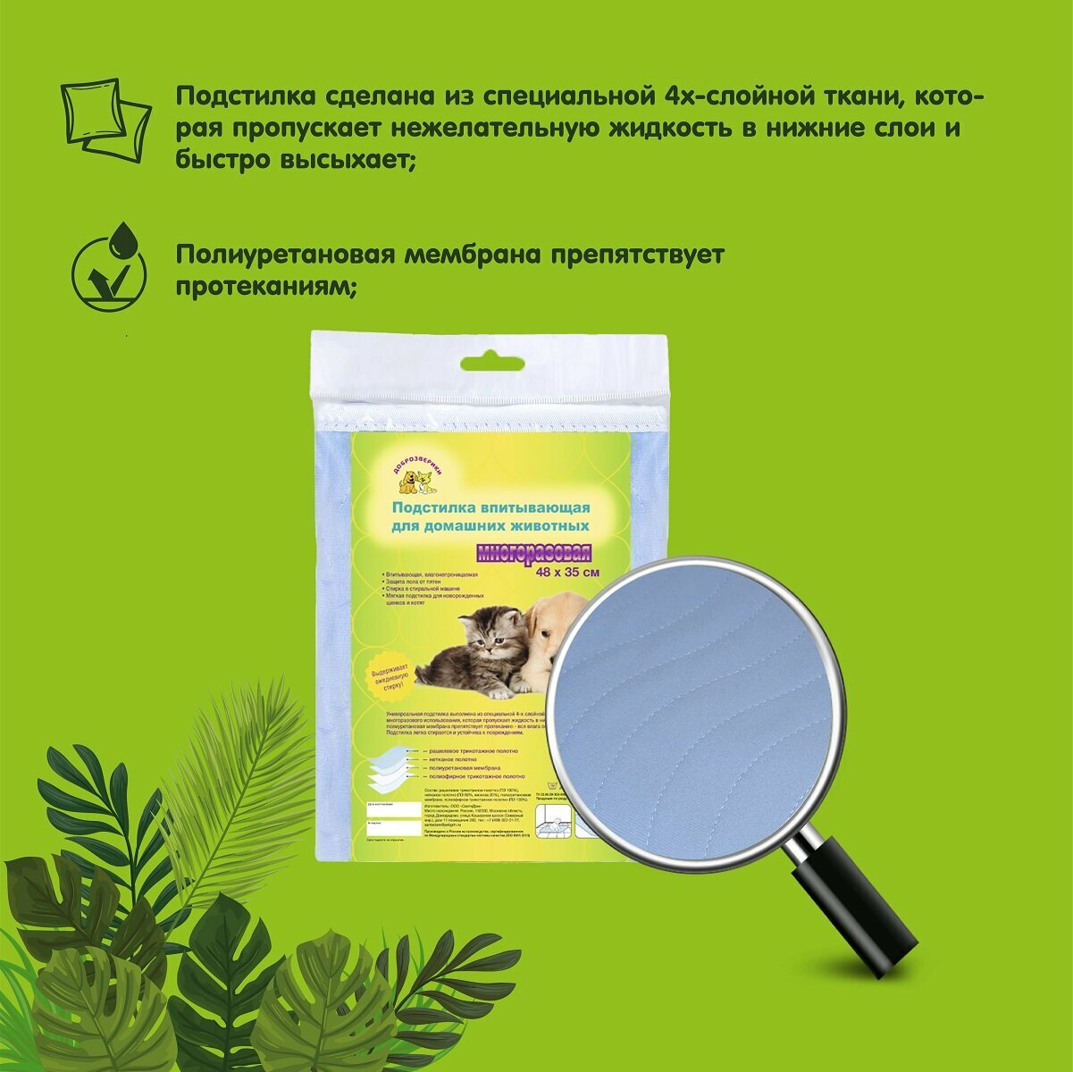 Ниже Вы можете прочитать отзывы на Пеленка многоразовая впитывающая для животных Доброзверики, 48х35 см., ознакомится с подробными характеристиками, посмотреть интересные обзоры и фотографии на Пеленка многоразовая впитывающая для животных Доброзверики, 48х35 см..