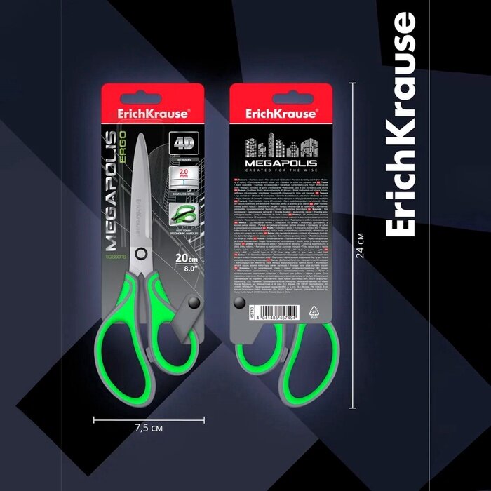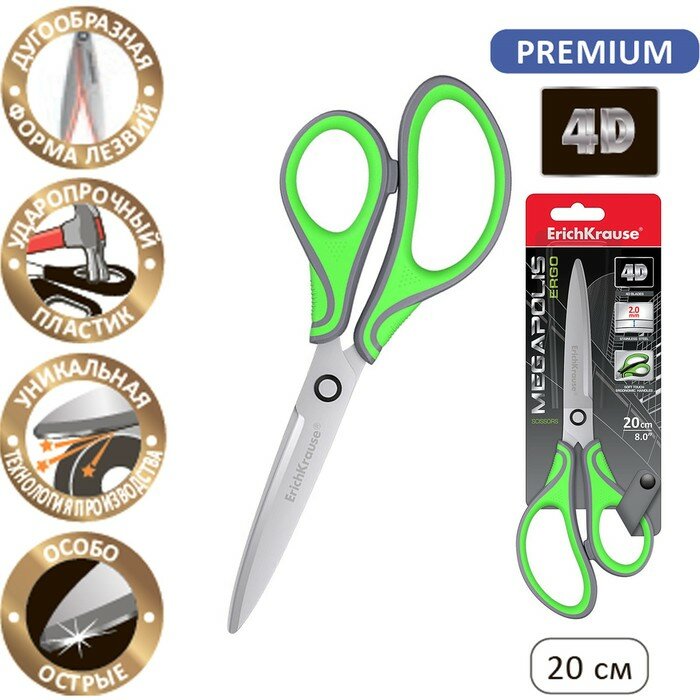 Ножницы Erich Krause Megapolis Ergo, 20 см, с усовершенствованными 4D-лезвиями, не ржавеют, ручки с резиновыми вставками, в блистере