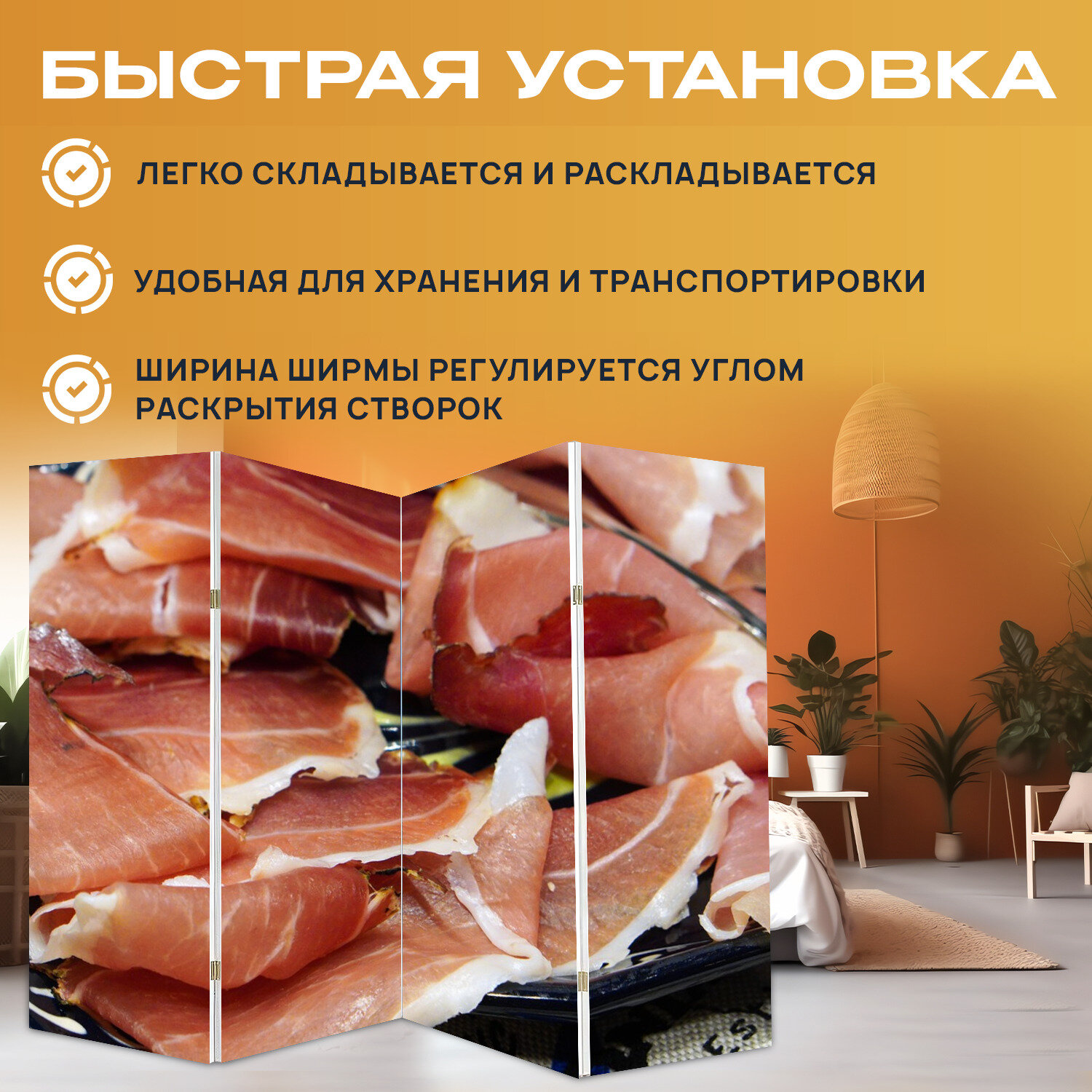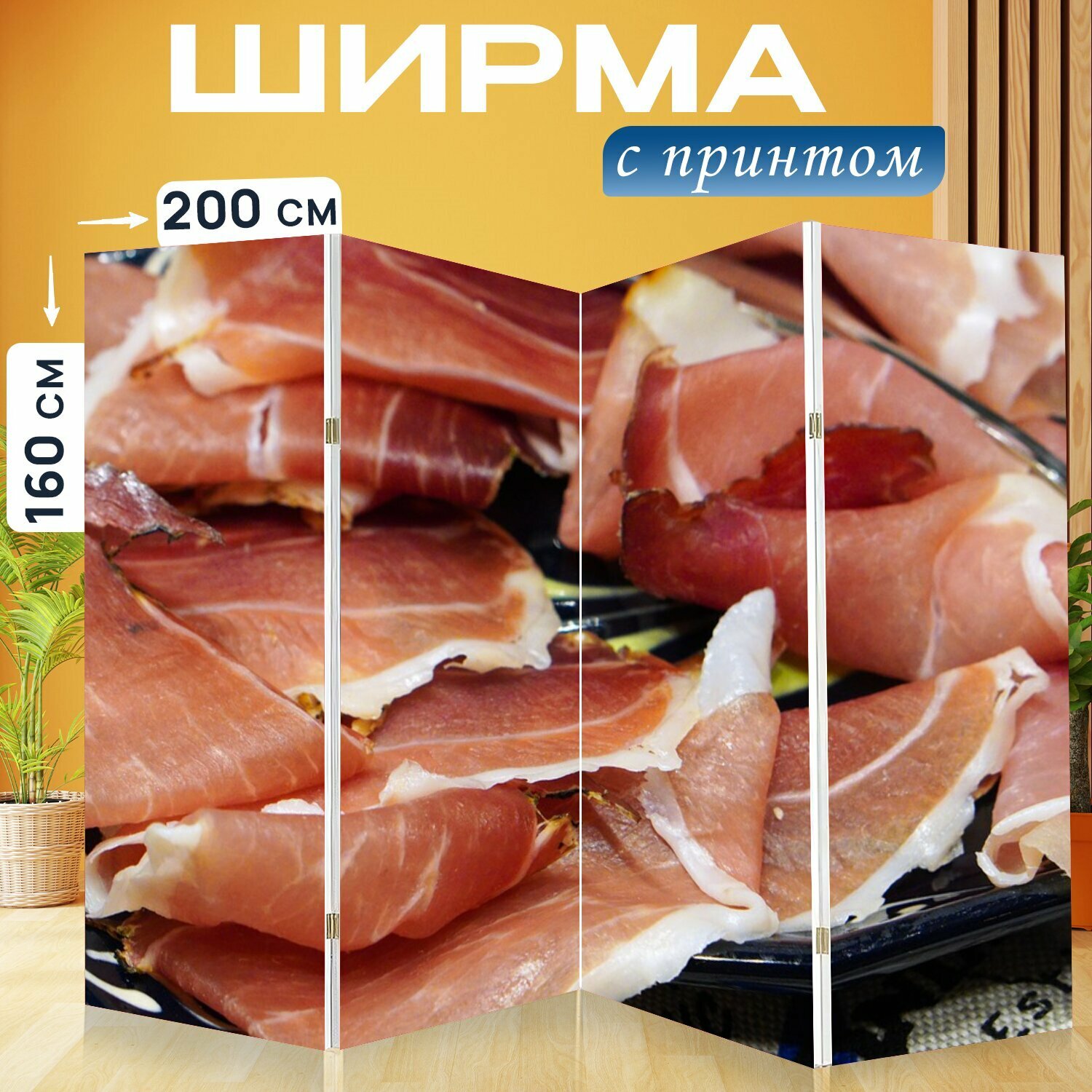 Ширма "Ветчина, мясо, еда" раскладная перегородка для зонирования с принтом на холсте интересное:
