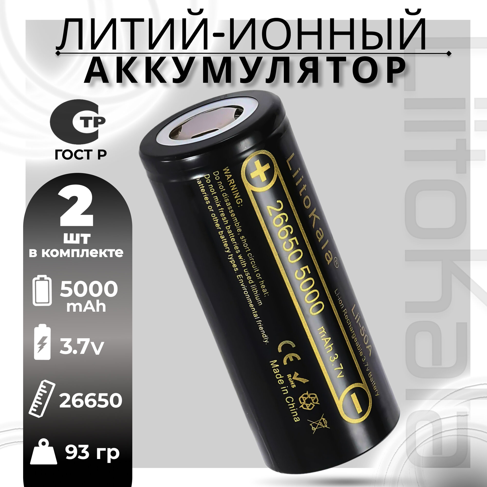 2 Аккумулятора LiitoKala 26650 литиевый 3,7 в, 5000 мА ч, подходит для фонариков
