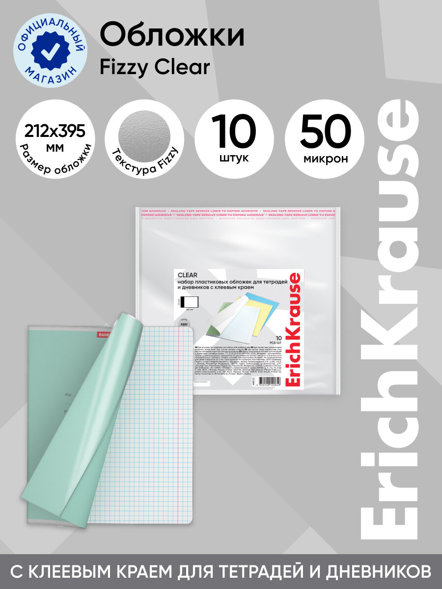 Набор пластиковых обложек ErichKrause Fizzy Clear для тетрадей и дневников, с клеевым краем, 212х395мм, 50 мкм (пакет 10 шт.)