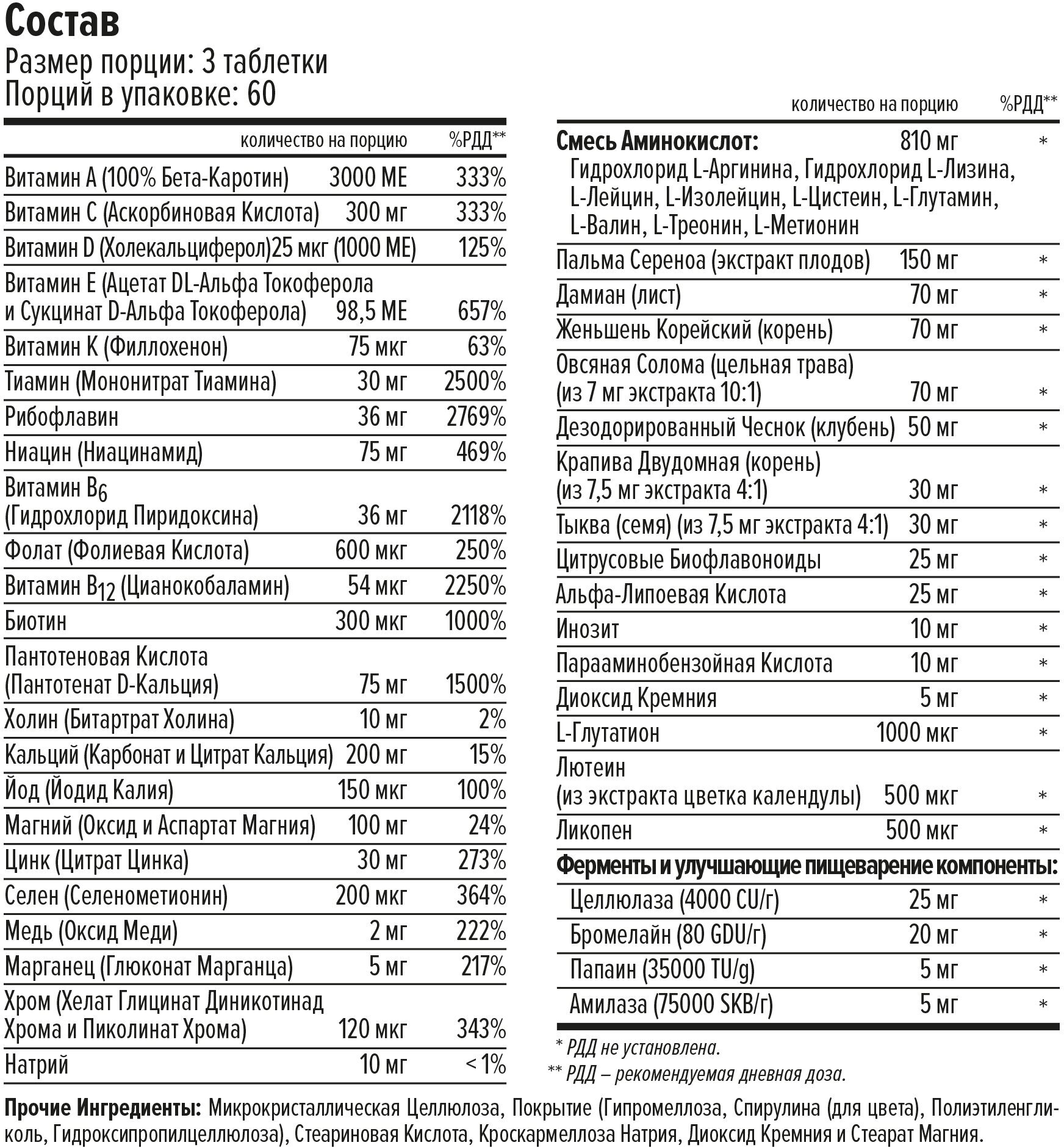 Фирма:Maxler Тип:Витамины. Описание: Созданный специально для мужчин комплекс ключевых минералов и экзотических фито-добавок VitaMen способствует улучшению умственной и физической активности, здоровью простаты, снижает негативные последствия стресса и нормализует функцию пищеварительной системы. Данный продукт снабжает ваш организм важными и быстро усваиваемыми аминокислотами, которые способствуют росту мышц. VitaMen содержит все, что вам необходимо для достижения максимальных результатов! Принимать: VitaMen по 3 табл. / день одновременно, или равномерно распределяю после основных приемов пищи. Ограничения традиционно касаются несовершеннолетних, кормящих и беременных. Превышение дозы не улучшит результат, а может привести к ухудшению. В связи с этим категорически запрещено превышать дозировку. Перед использованием проконсультируйтесь у врача. Хранить в недоступном от детей месте. СОСТАВ 1 порция витаминов VitaMen (3 капсулы) содержит: Цинк - 0,015 гр. Йод - 0,15 гр. Кальций - 0,35 гр. Магний - 0,20 гр. Хром - 0,12 гр. Селен - 0,1 мг. Медь - 2 мг. Биотин - 0,10 мг. Фол. кислота - 0,4 мг. Тиамин - 0,05 гр. Витамины: С - 0,25 гр. Е - 200 МЕ А - 5 000 МЕ К - 0,08 мг. D - 400 МЕ В12 - 0,1 мг. В6 - 0,01 гр. Продукт не является лекарственным средством. Не рекомендуем использовать продукцию лицам, не достигшим 18 лет. Перед началом приема любого продукта обязательно проконсультируйтесь у специалиста! |