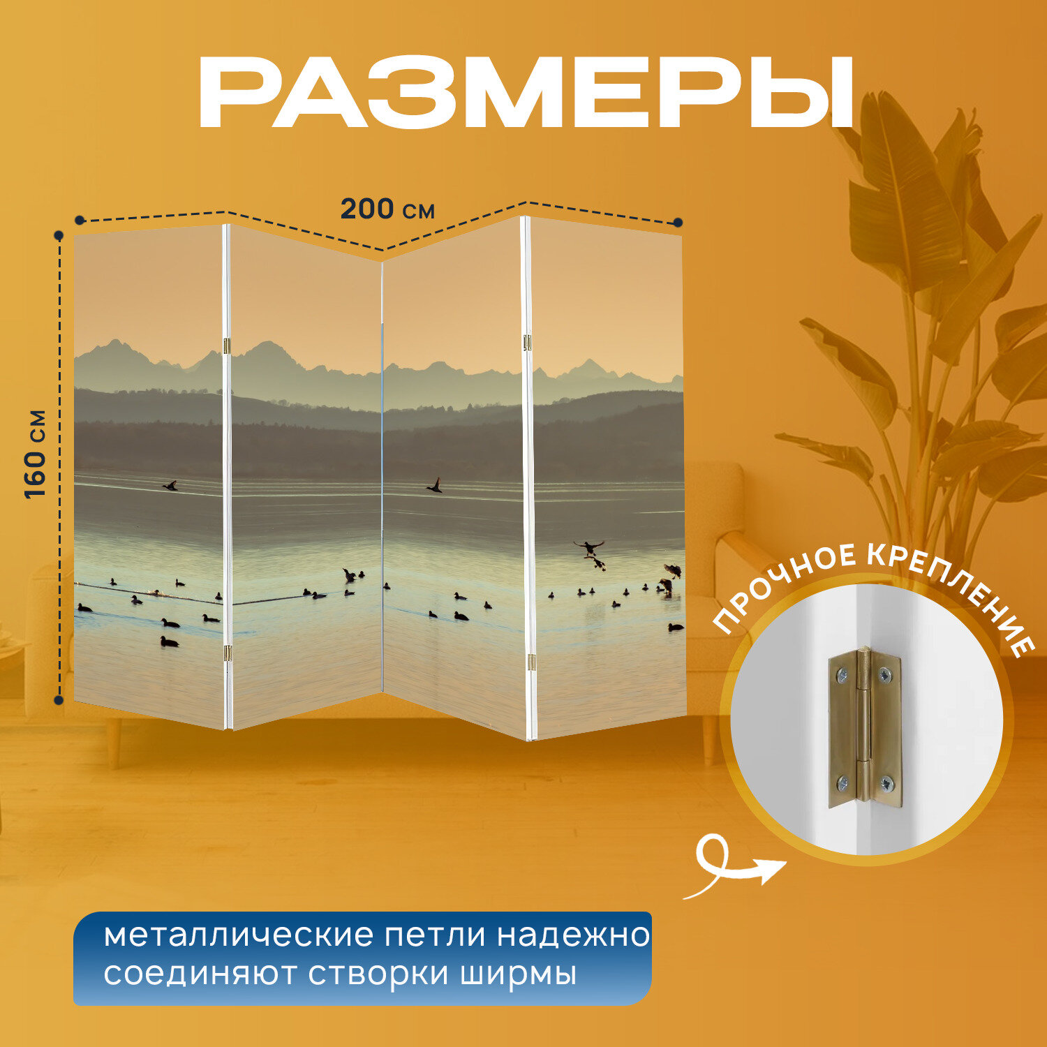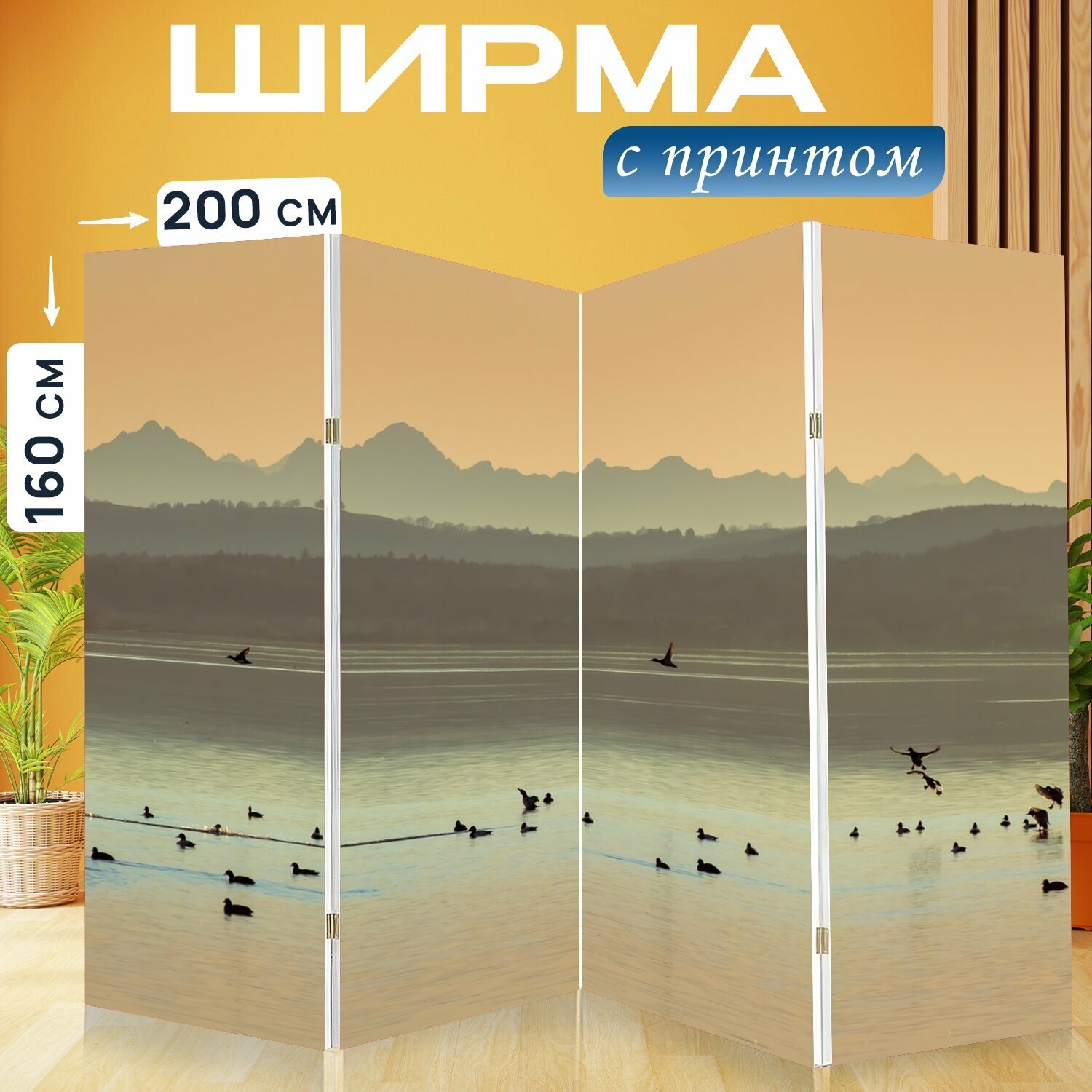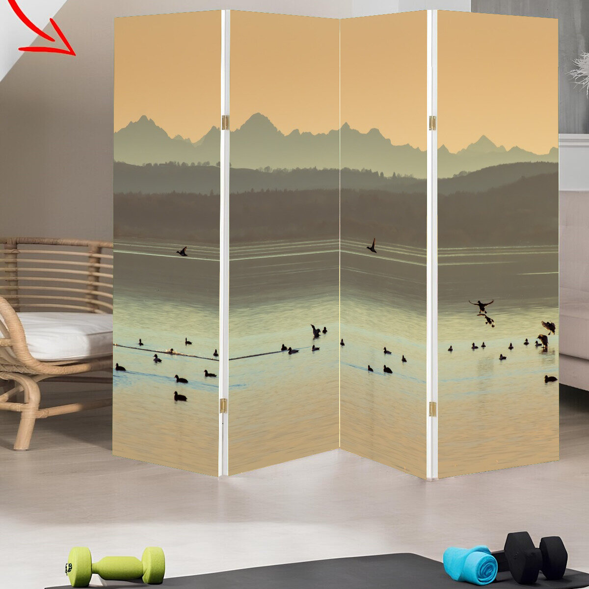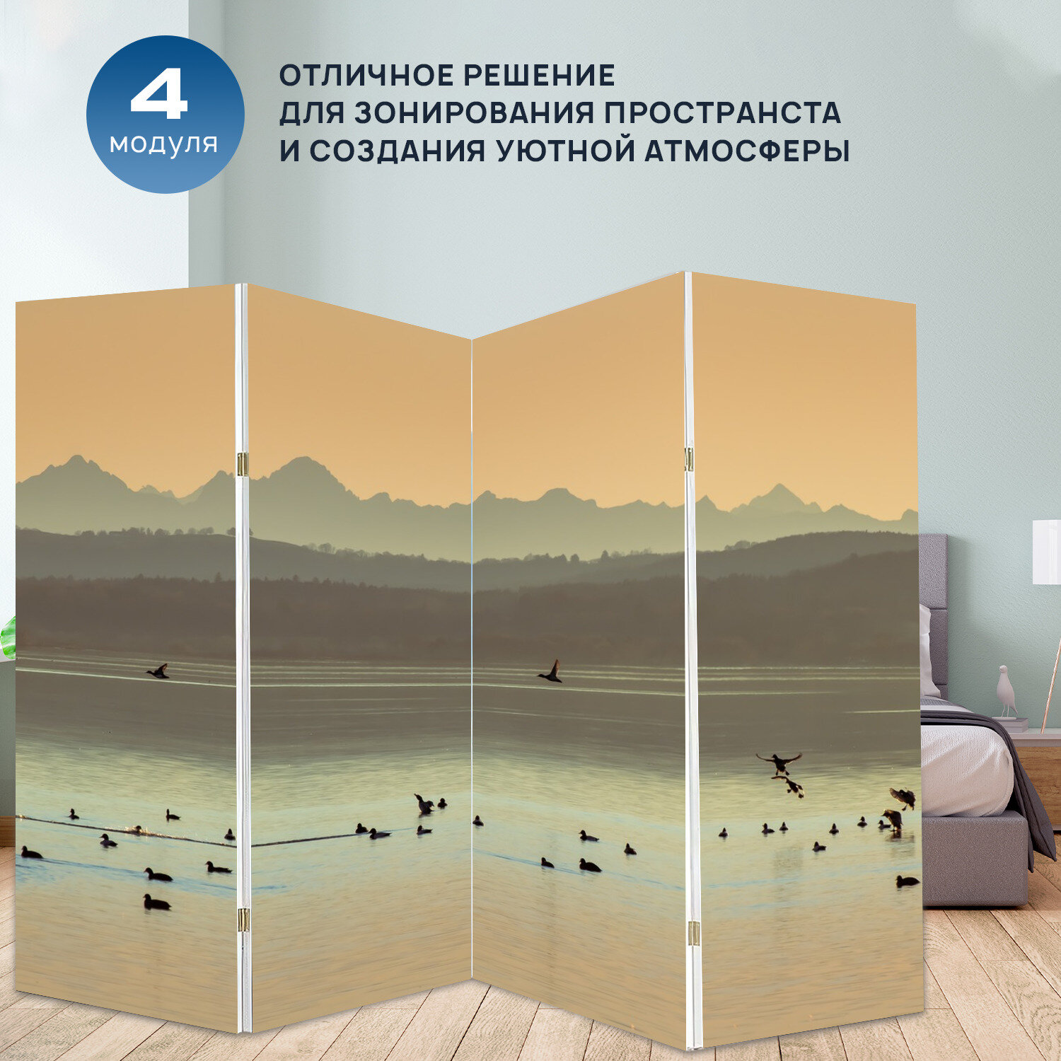 Ширма "Озеро, горы, птицы" перегородка для зонирования комнаты с принтом 280x175 см. на холсте