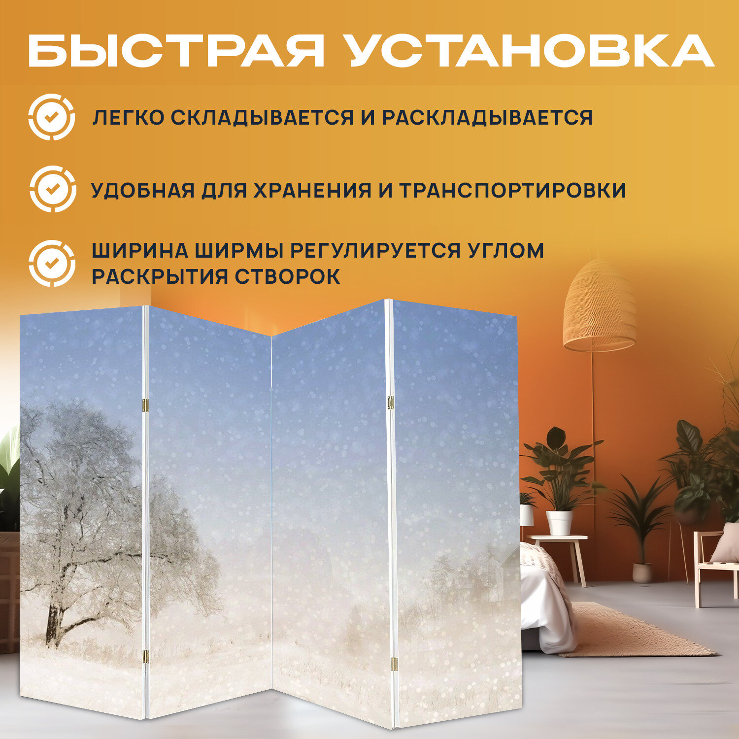 Купить Ширма "Зима, рождество, снег" раскладная перегородка для зонирования с принтом на холсте