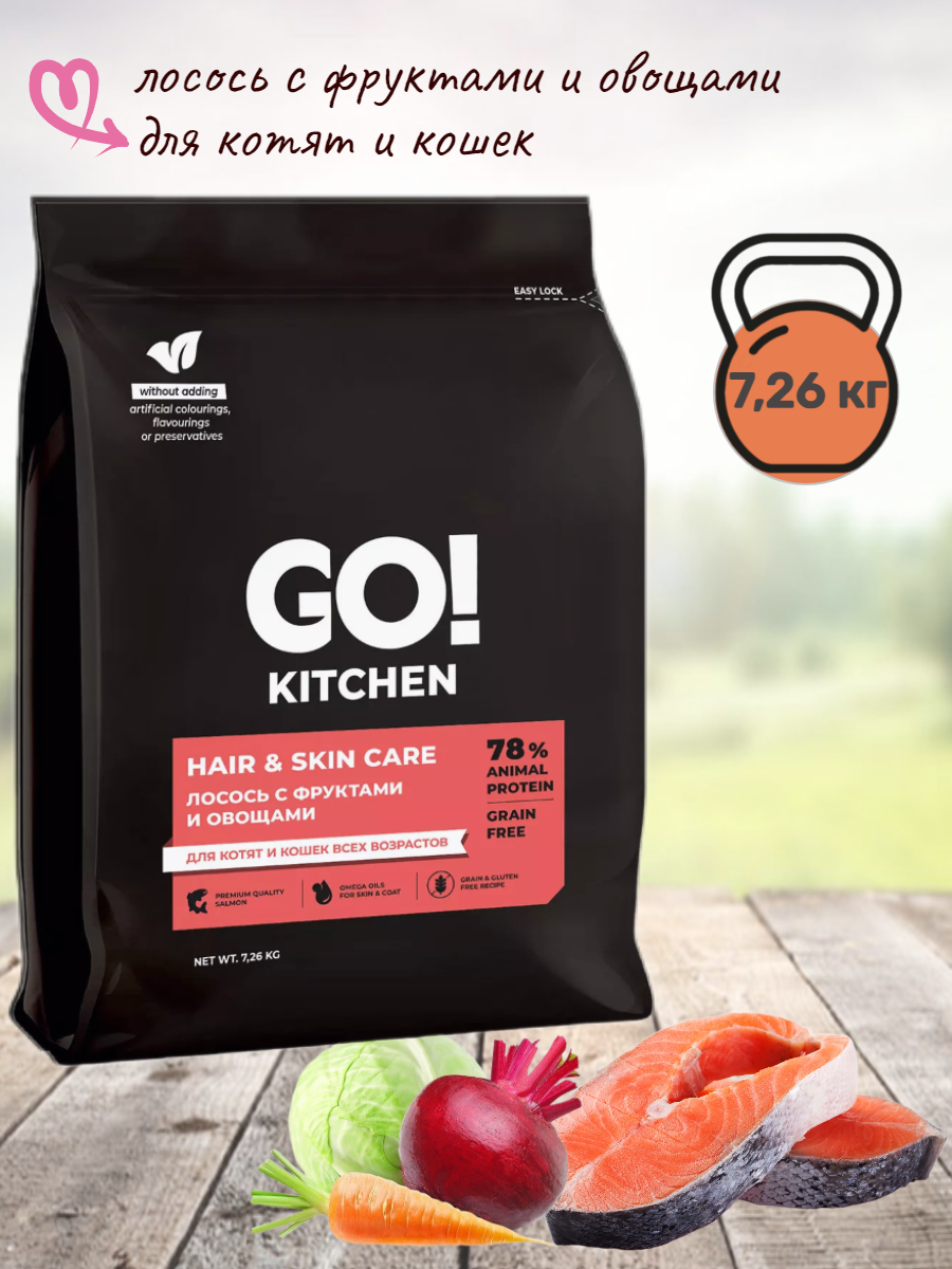 GO'KITCHEN сухой корм для котят и кошек всех возрастов со свежим лососем, фруктами и овощами, HAIR+SKIN CARE Salmon (3.63 кг)
