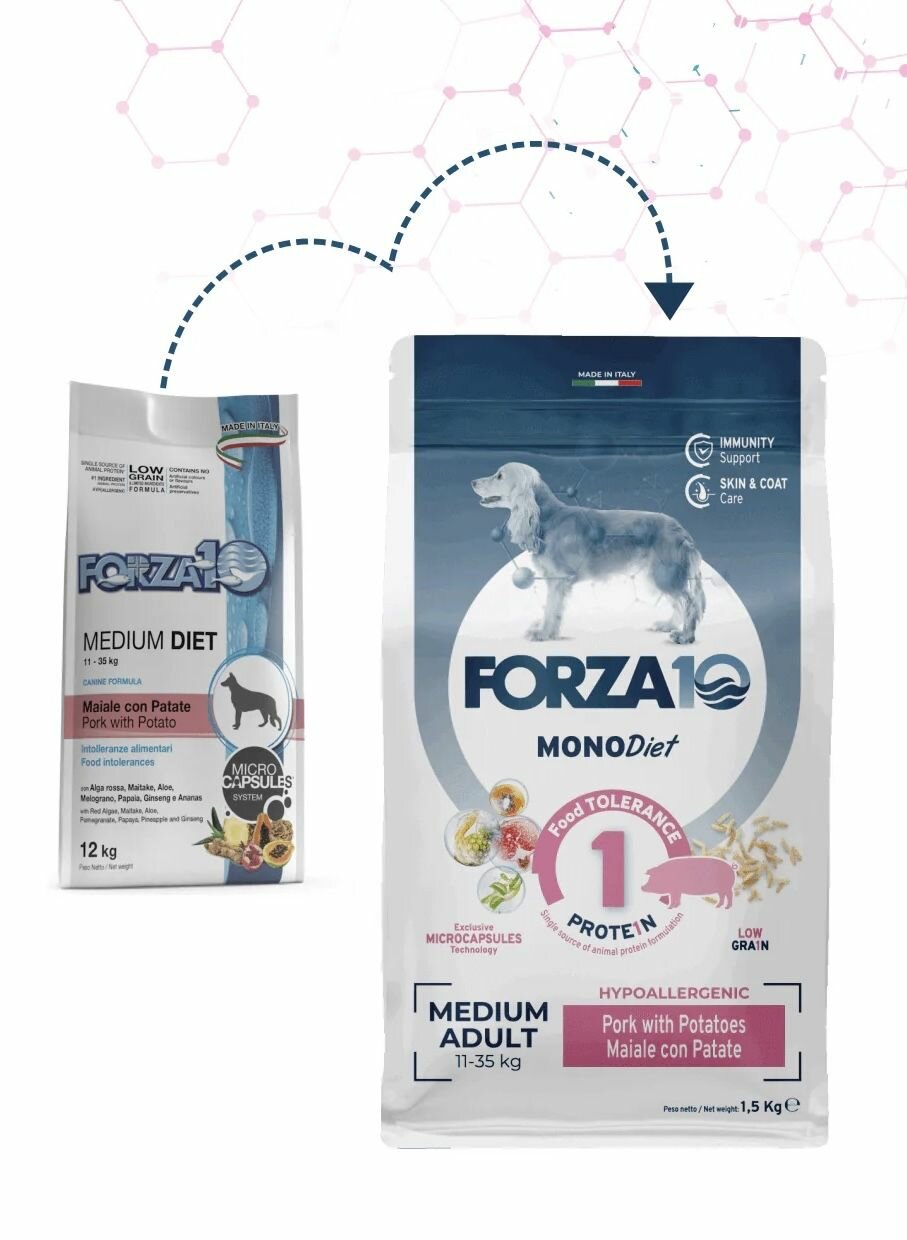 Сухой корм Forza10 Medium Diet для взрослых собак средних пород, со свининой, картофелем с микрокапсулами, 1,5 кг