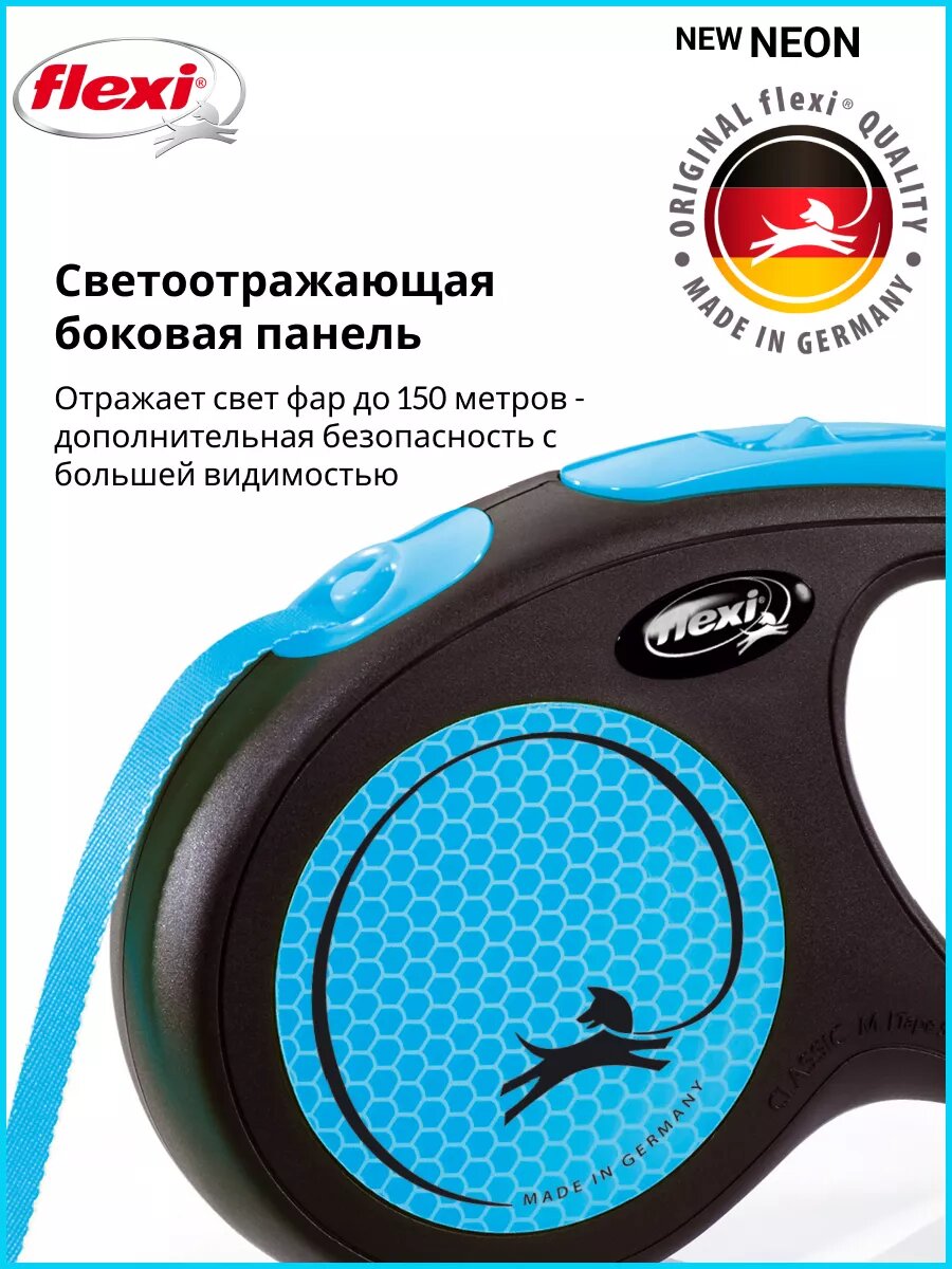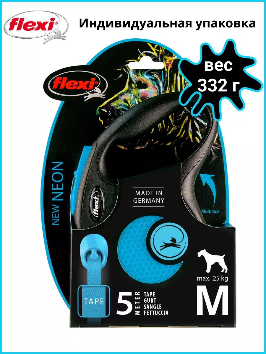 flexi рулетка Neon Classic M до 25 кг лента 5 м светоотражающая голубой неон .