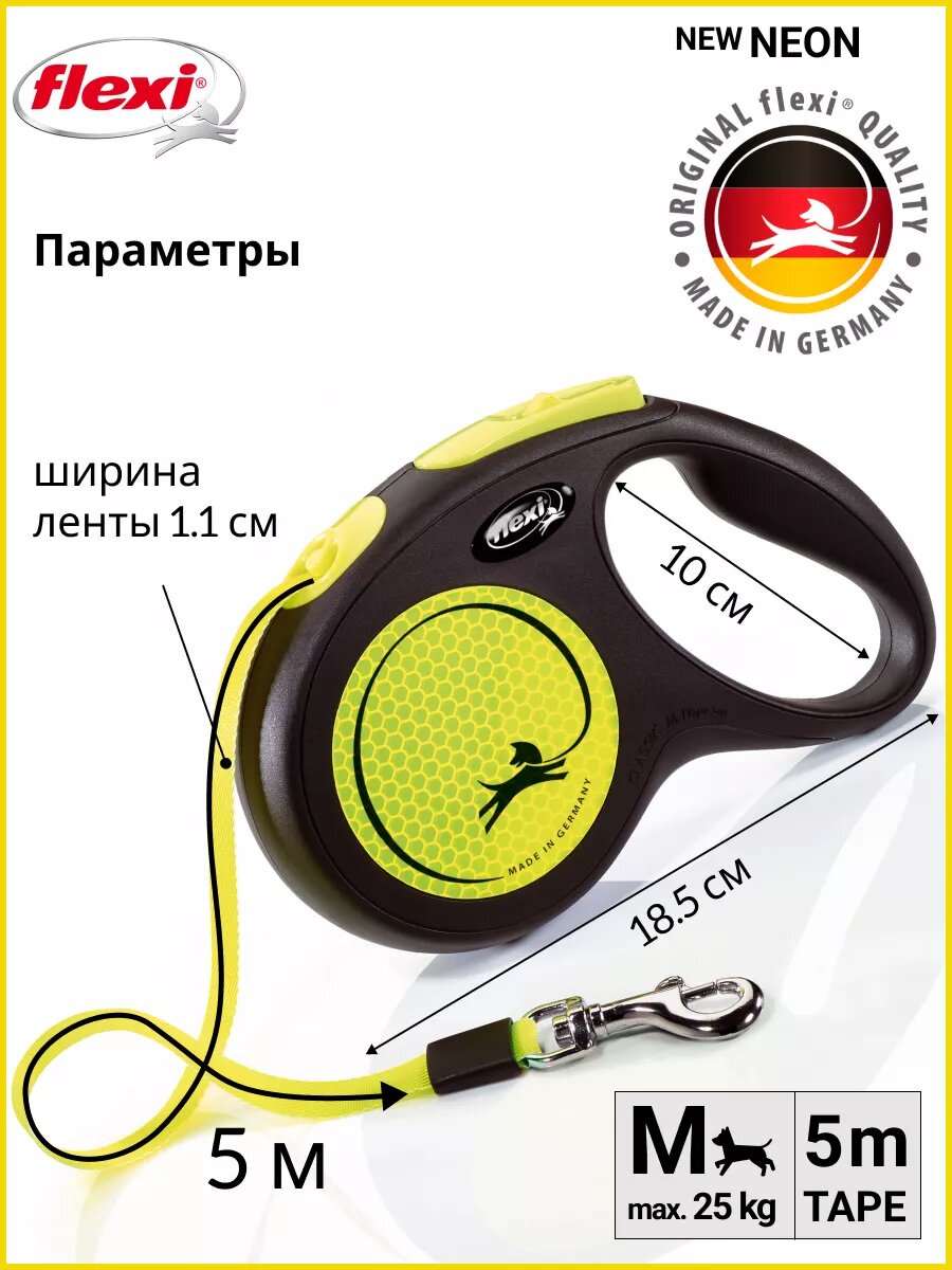 flexi рулетка Neon Classic M до 25 кг лента 5 м светоотражающая зеленый неон .