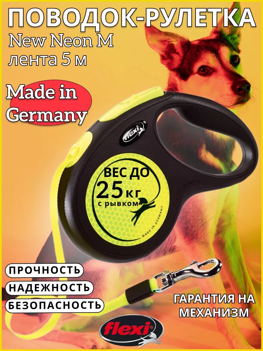 Flexi New Neon M Рулетка для собак весом до 25кг длинна 5м с ремнём