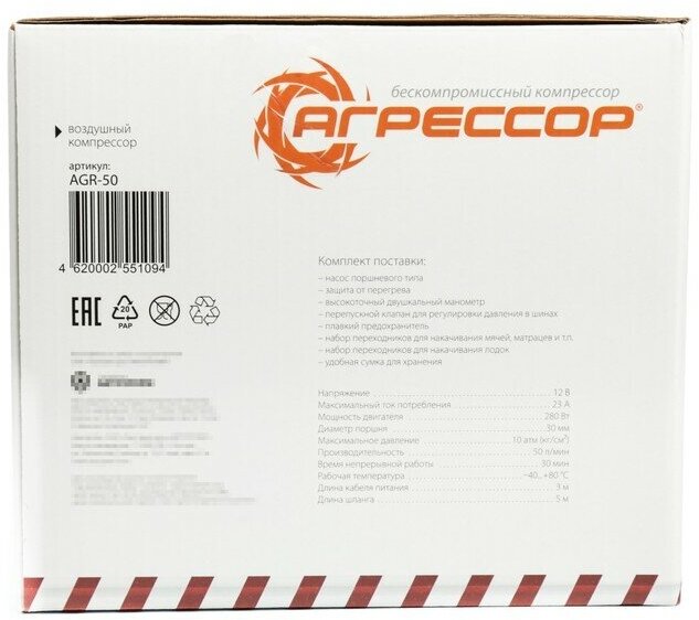 AGR50 агрессор AGR-50_компрессор! Агрессор 50л/мин 12V/23A 280W 10атм, шл.5м, метал.,прикур/крокод, 4перех+д/лодок\