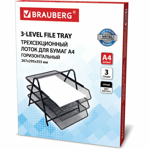 Лоток горизонтальный металлический для бумаг, 3 секции, BRAUBERG "Germanium", А4 (267х355х295 мм), черный, 231952 В комплекте: 1шт.