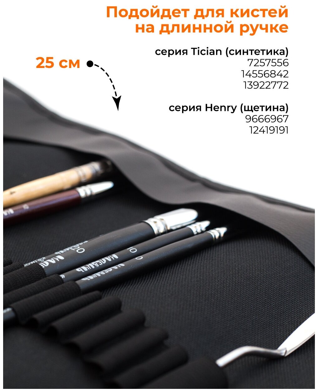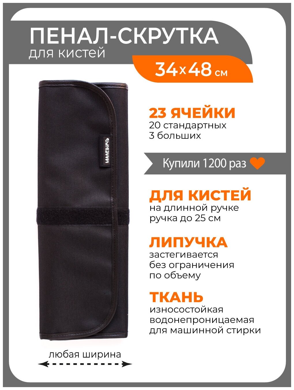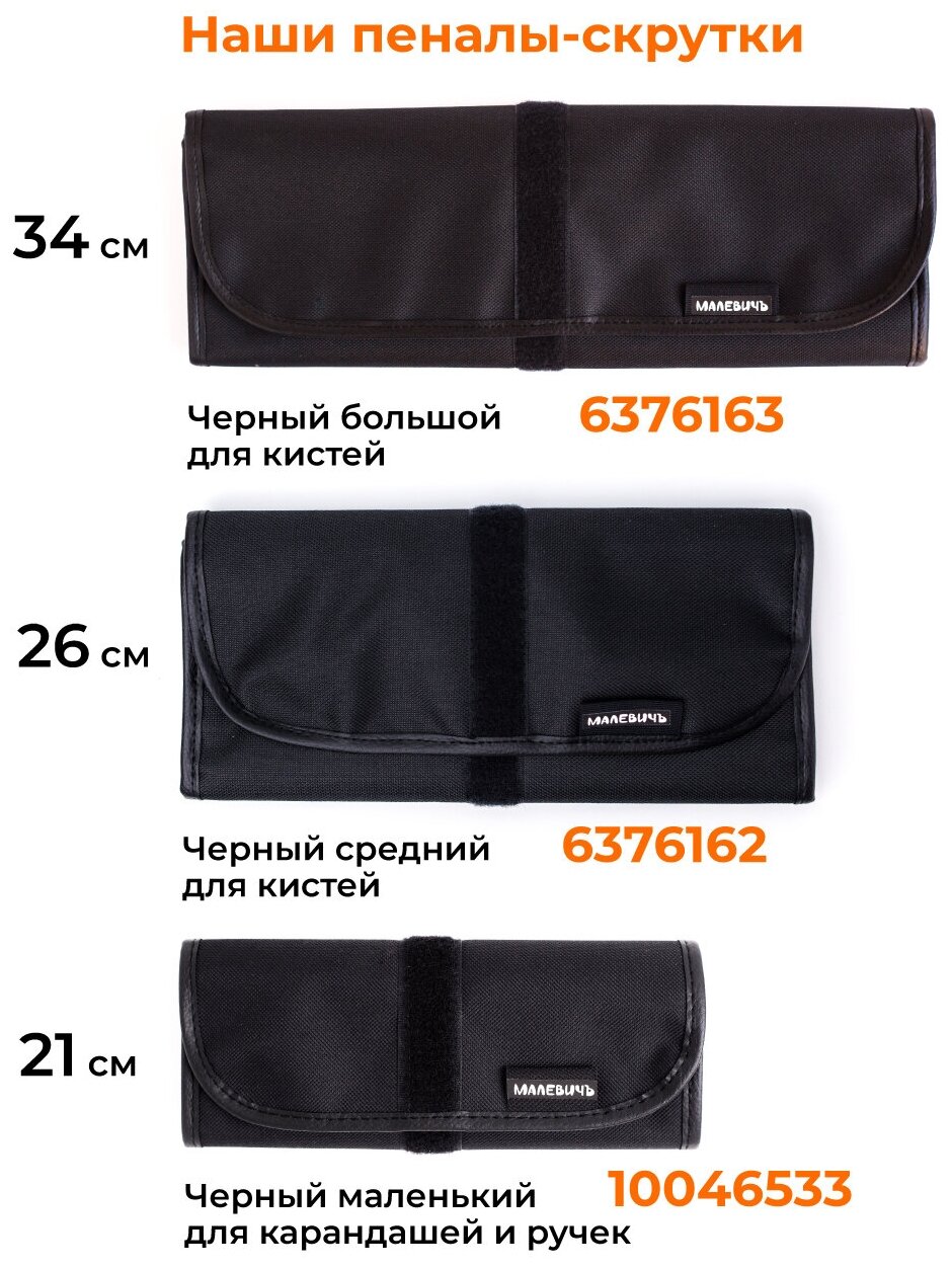Малевичъ Пенал-скрутка для кистей на липучке, 340 х 480 мм, на 24 предмета, Малевичъ, чёрный 195006