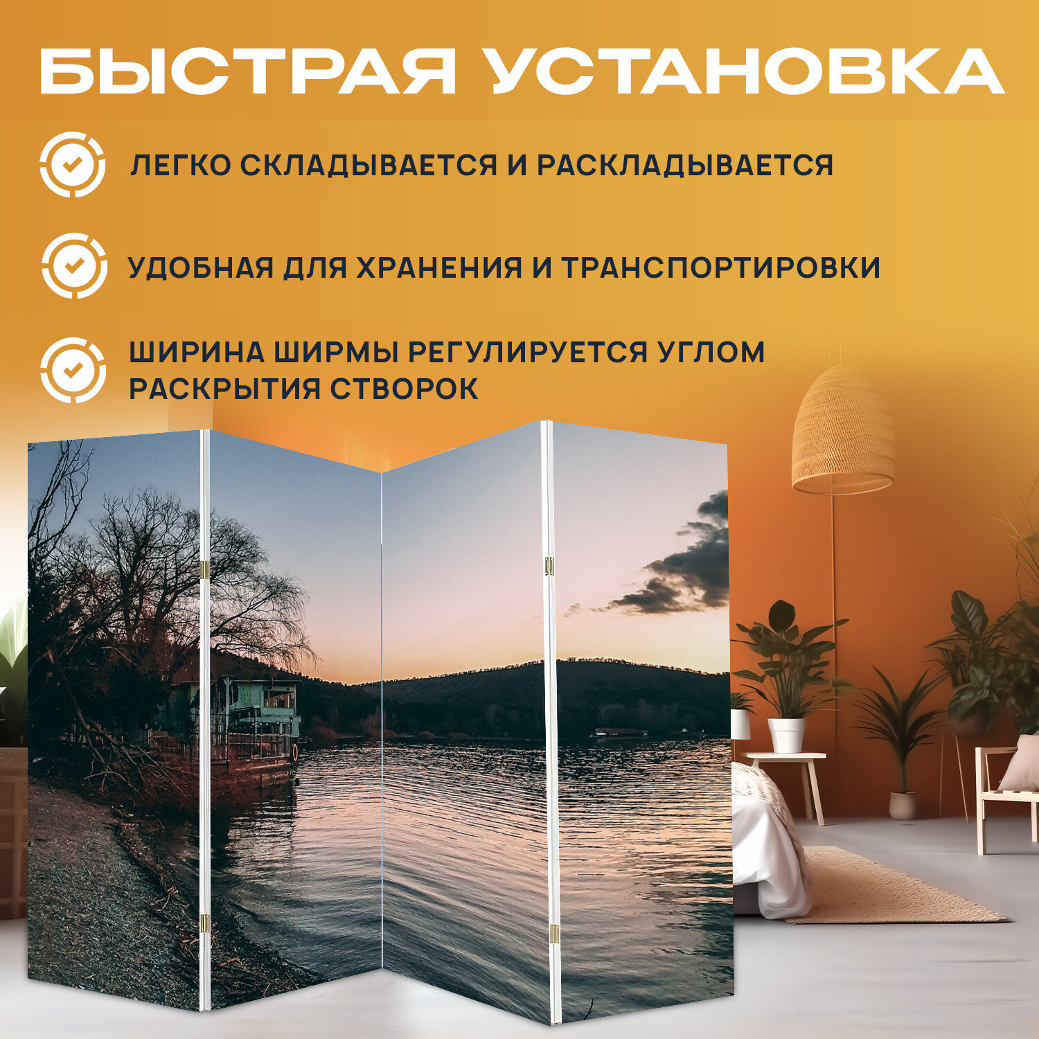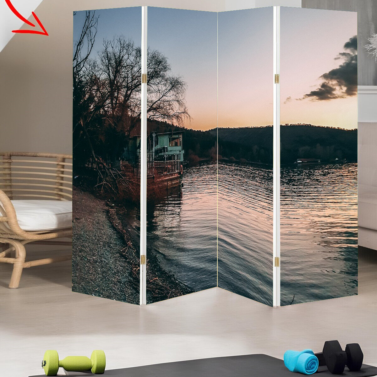Ширма "Озеро, эллинг, заход солнца" перегородка для зонирования комнаты с принтом 280x175 см. на холсте