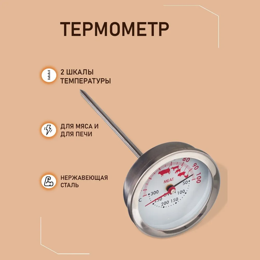 | Плюсы: | Использую для контроля температуры мяса. Удобно, что есть две шкалы, вторая показывает температуру в духовке. |