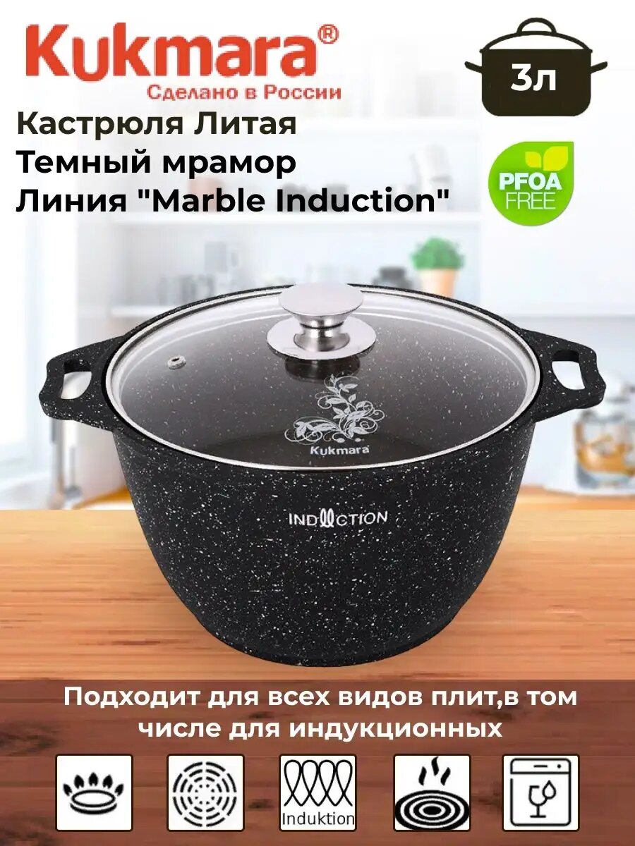 Кастрюля Kukmara "Marble Induction" 3 л с антипригарным покрытием, со стеклянной крышкой, индукционная