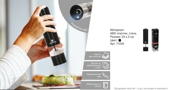 | Плюсы: | В данной электромельнице, меньшее количество батарей (всего 4 пальчиковых), в отличие от предыдущей (6-мизинчиковых), электромельницы, приобретенной мной в Ситилинке. Еще внутри колпачка есть пластмассовое кольцо, которое фиксирует эти батареи. Со старой я намучалась, приходилось фиксировать их скотчем, они все норовили выскочить. Подсветка была и в предыдущей модели, по мне так очень удобно, когда мелешь перчик сразу в тарелку, доза специи хорошо контролируется. |