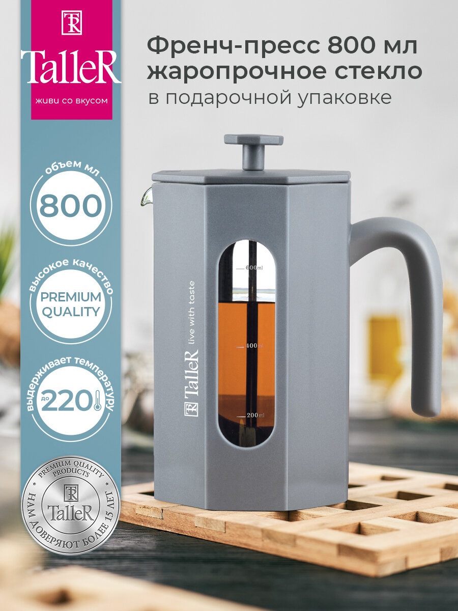 Купить Френч-пресс TalleR TR-32344 Лоренцо 800 мл, нержавеющая сталь, боросиликатное стекло
