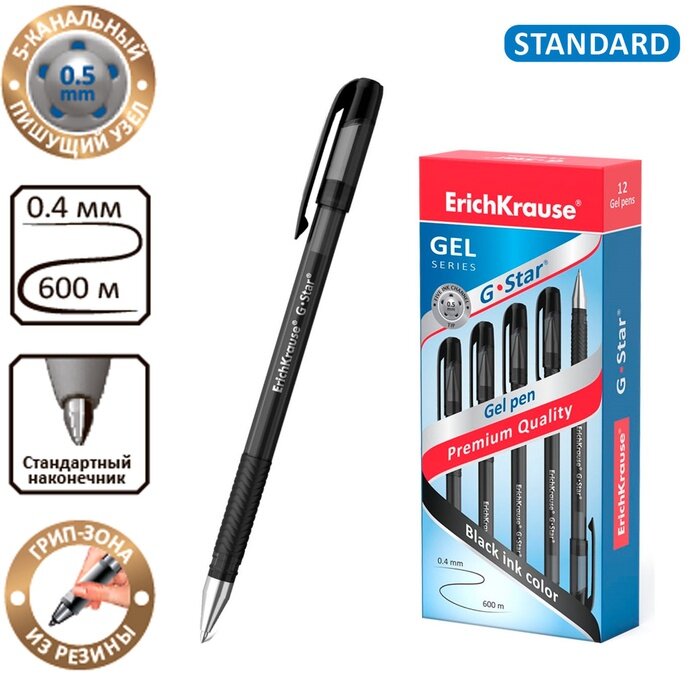 Ручка гелевая Erich Krause G-Star, узел 0.5 мм, чернила чёрные, грип-зона из резины, длина письма 600 метров, 12 штук