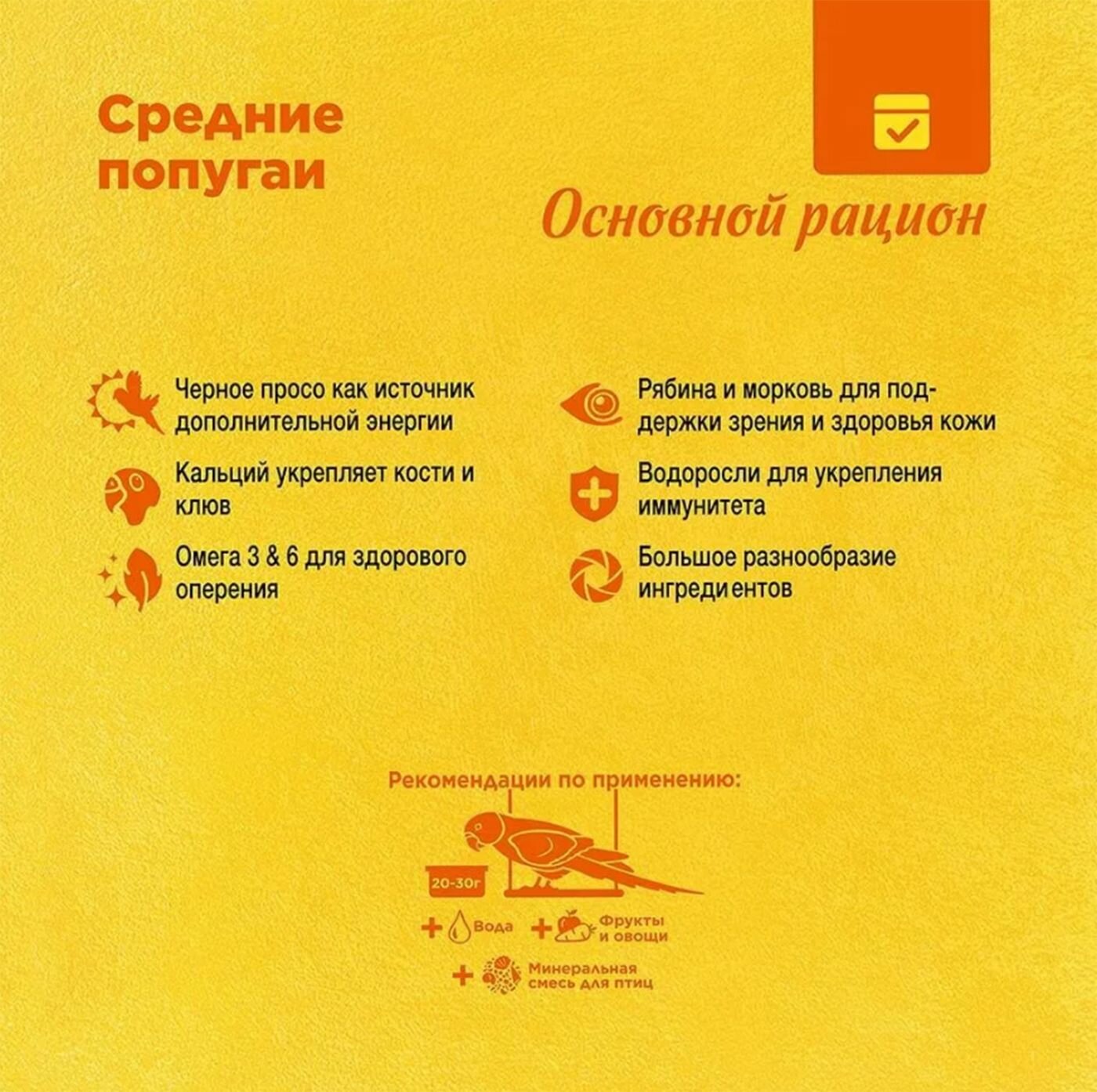 | Отзыв: | Хватает двум средним попугаям на 2 месяца, учитывая, что даём дополнительно витамины и всякую зелень/фрукты/овощи |