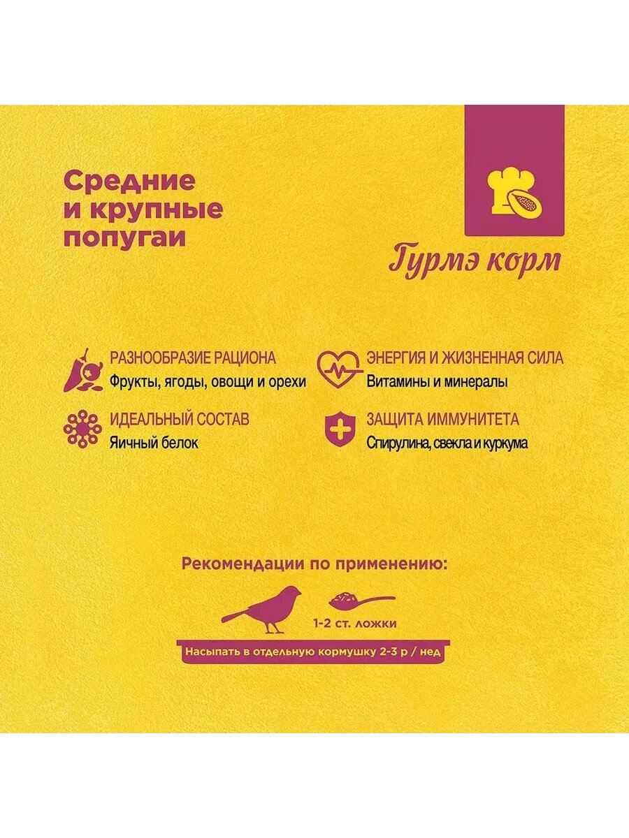 | Отзыв: | Отличный корм, богатый содержанием. Попугай ест только его |